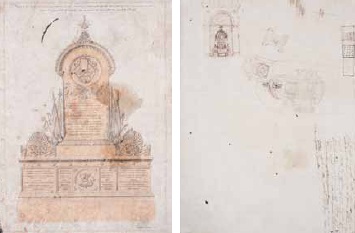 Guglielmo Calderini Perugia 1837 – Roma 1916 (A) MONUMENTO AI CADUTI DEL 20 GIUGNO matita, china e acquerelli su carta, cm 42,5x32. Firmato in basso a destra: Guglielmo Calderini arch. (B) BOZZETTI matita, china e acquerelli su carta, cm 35x27.