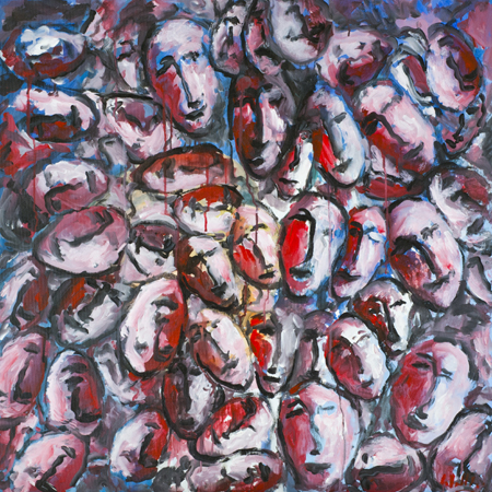 Enrico Cestarelli Firenze 1951 Figli delle stragi Olio su tela, cm. 79x79 Firmato in basso a destra. Sul verso: firma, titolo e dedica a persona.