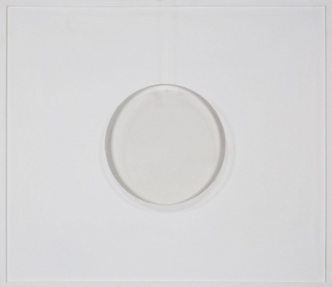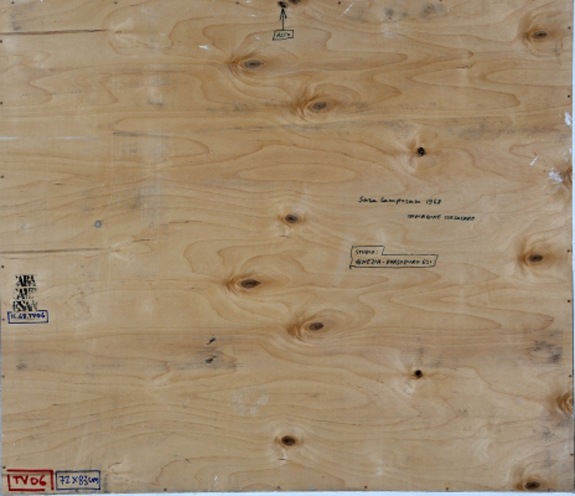SARA CAMPESAN 1924 – 2016 Immagine circolare, 1968 Pittura su tavola e plexiglass appeso, cm. 70 x 80 Firmato e datato sul retro Timbro dell’artista sul retro Prov. Collezione Privata