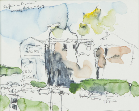 Walter Piacesi Ascoli Piceno 1929 Periferia a Rimini, 1979 Tecnica mista su carta, cm. 12X15,5 Firma, data e titolo in alto a sinistra.