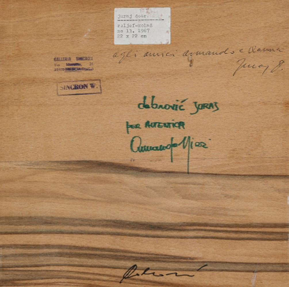 JURAJ DOBROVIC 1928 Relijef – kolaz no 13, 1967 Cartoncini plastificati sovrapposti, cm. 22 x 22 Firmato sul retro Timbro Galleria Sincron, Brescia sul retro Autentica di Armando Nizzi sul retro Dedica dell’artista sul retro Prov. Collezione Privata