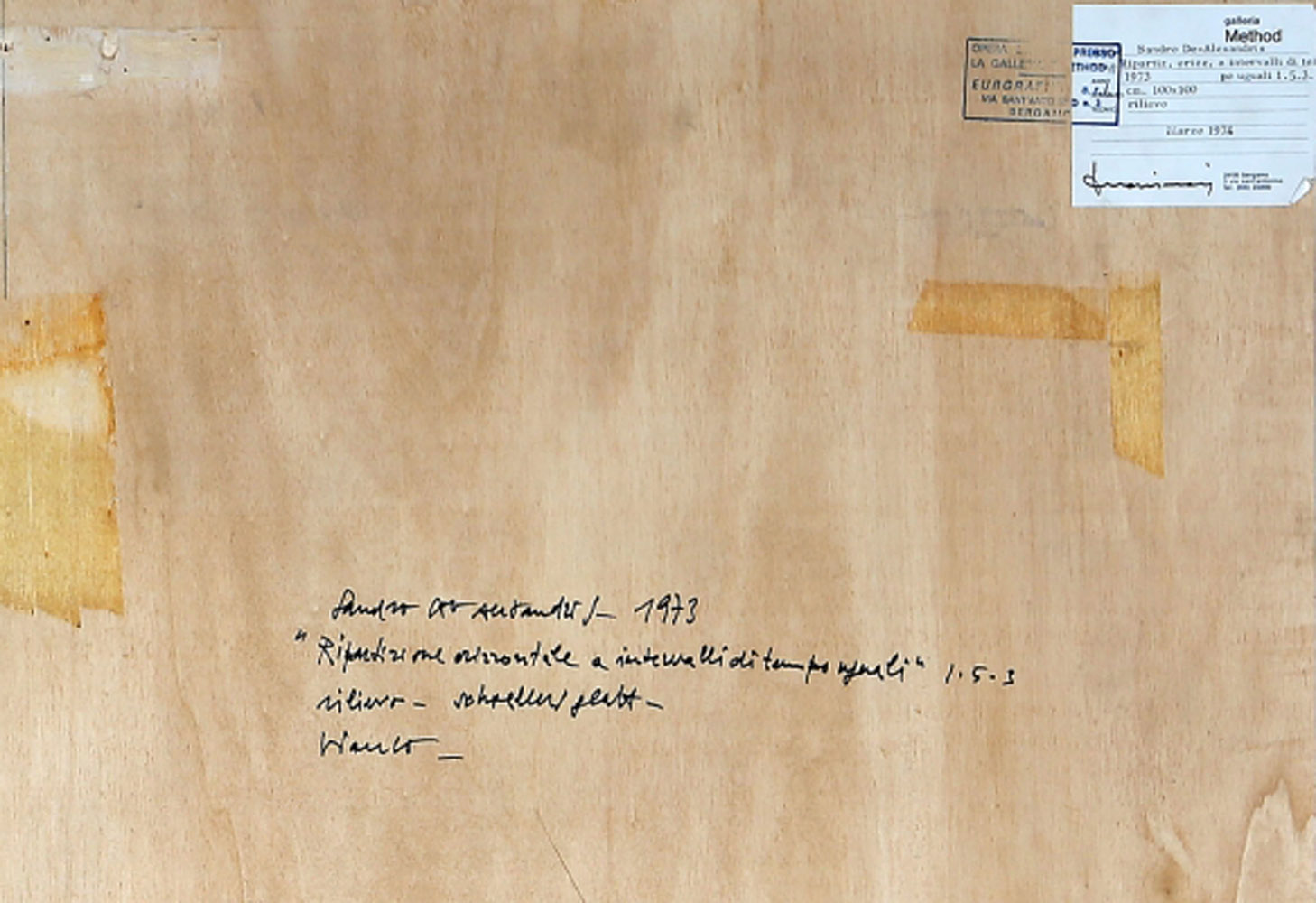 SANDRO DE ALEXANDRIS 1939 Riproduzione orizzontale a intervalli di tempo uguali 1 – 5 – 9, 1973 Incisioni su tavole bianche (rilievi), cm. 100 x 100 Firmato e datato sul retro Etichetta galleria Method, Bergamo Prov. Collezione Privata