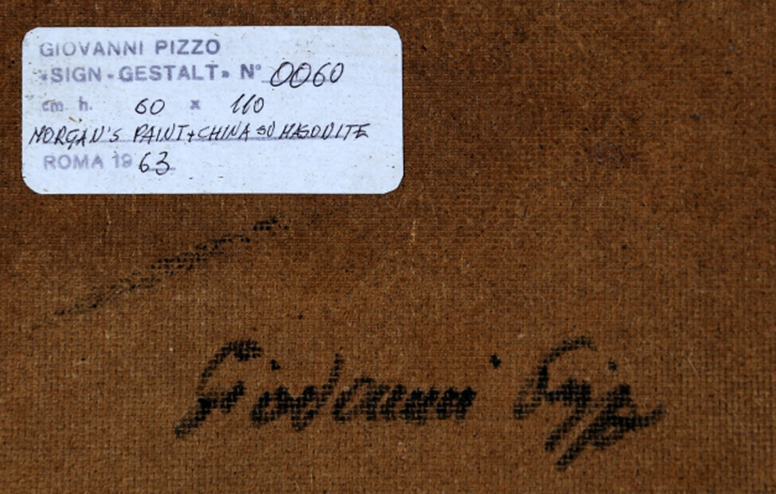GIOVANNI PIZZO 1934 Sign Gestalt n. 0060, 1963 Morgan’s paint e china su masonite, cm. 60 x 110 Firmato sul retro Etichetta dell’artista sul retro Autentica dell’artista su fotografia Prov. Collezione Privata