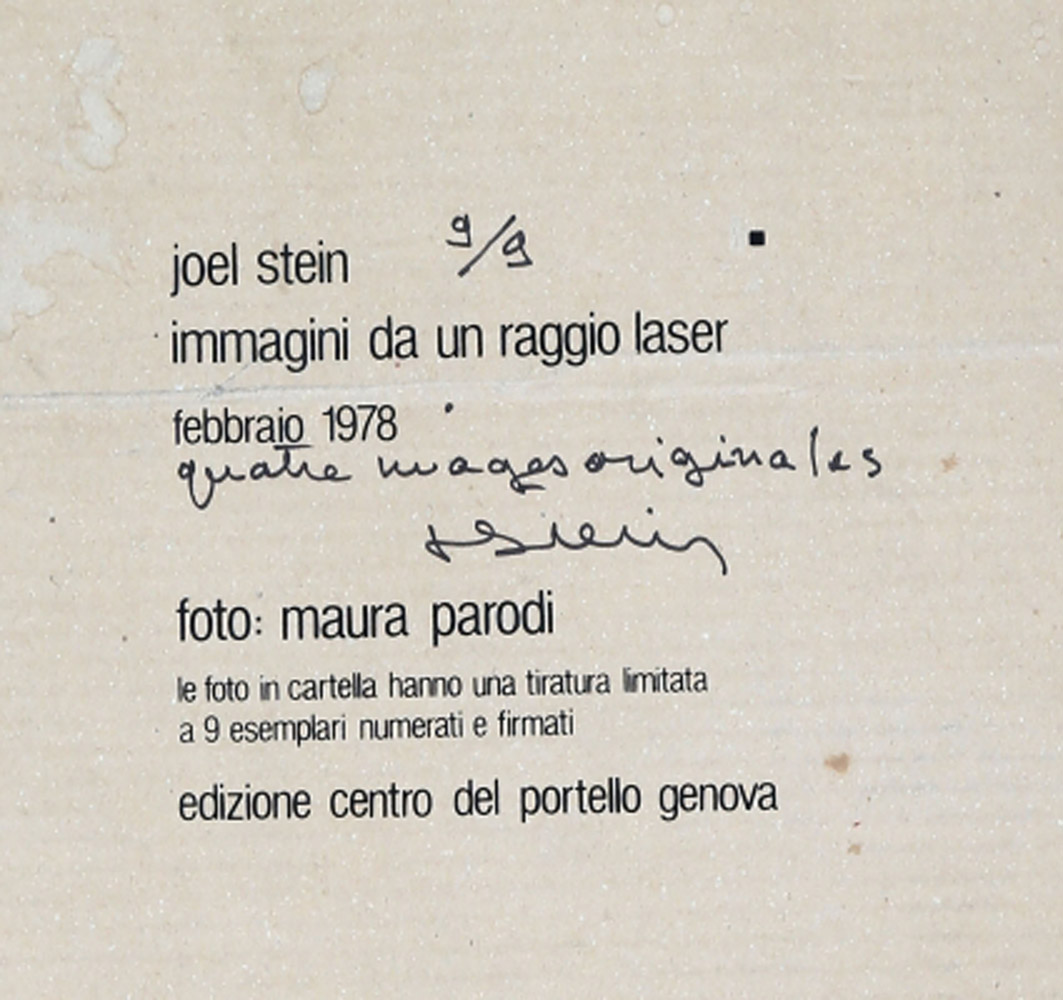 JOEL STEIN 1926 – 2012 Immagine da un raggio laser, 1978 Cartella 4 fotografie in b/n, cm. 54,5 x 45 (cad.) Cartella n. 9/9 Edizione Centro del Portello, Genova Prov. Collezione Privata