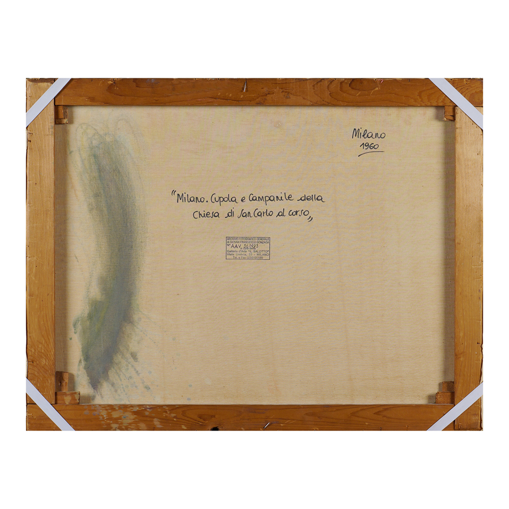 "Milano. Cupola e Campanile della Chiesa di San Carlo al Corso", 1960, olio su tela, firmato in basso a sinistra, entro cornice. Titolo, anno e timbro dell'Archivio al verso sulla tela