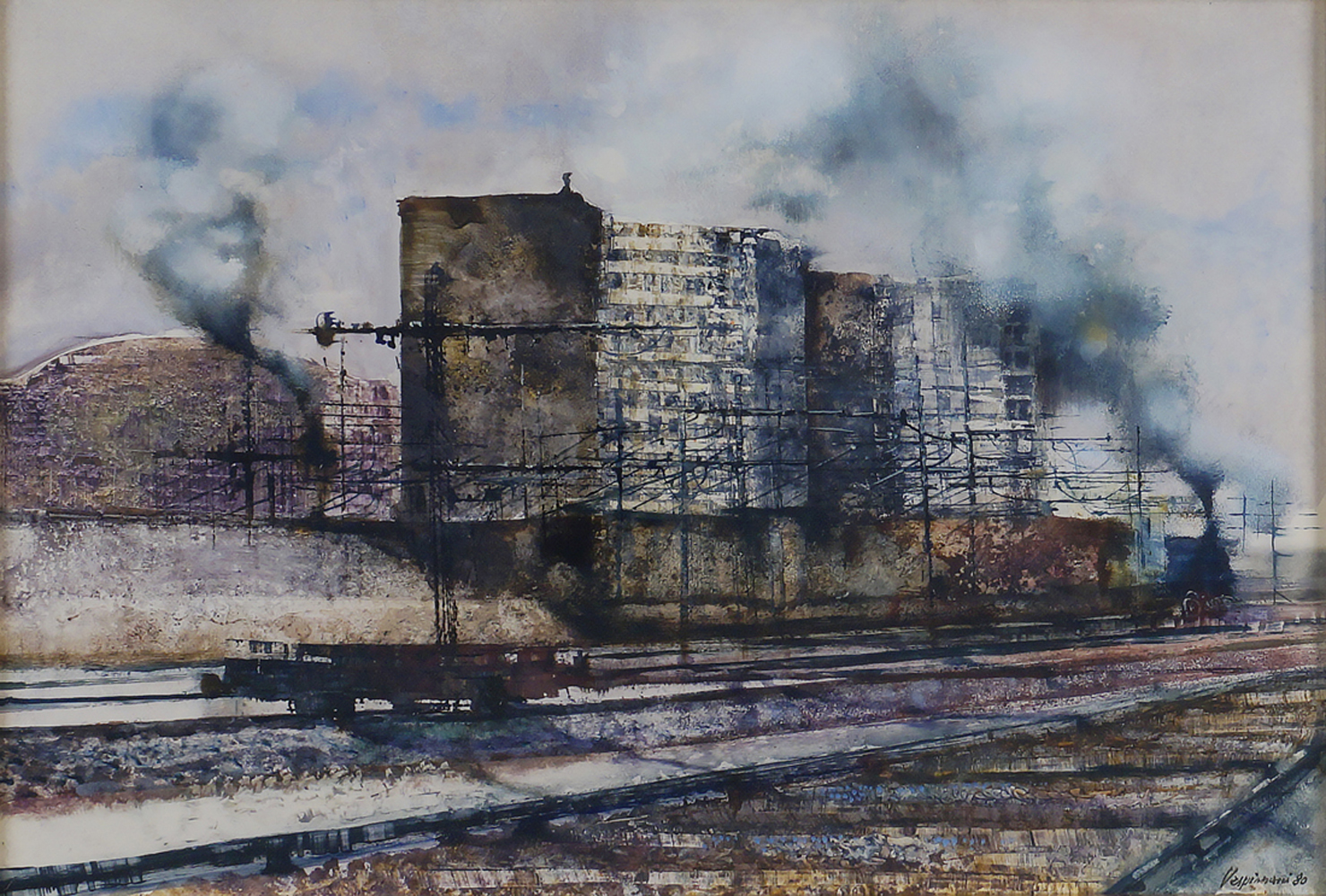 Renzo Vespignani Roma 1924 - 2001 35x50 cm. "Periferia", tecnica mista su cartoncino, firmata e datata '80 in basso a destra, entro cornice