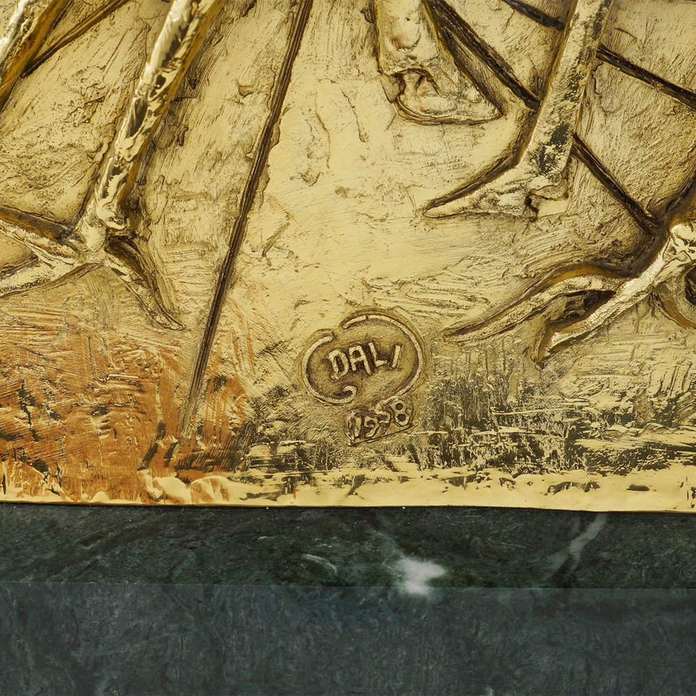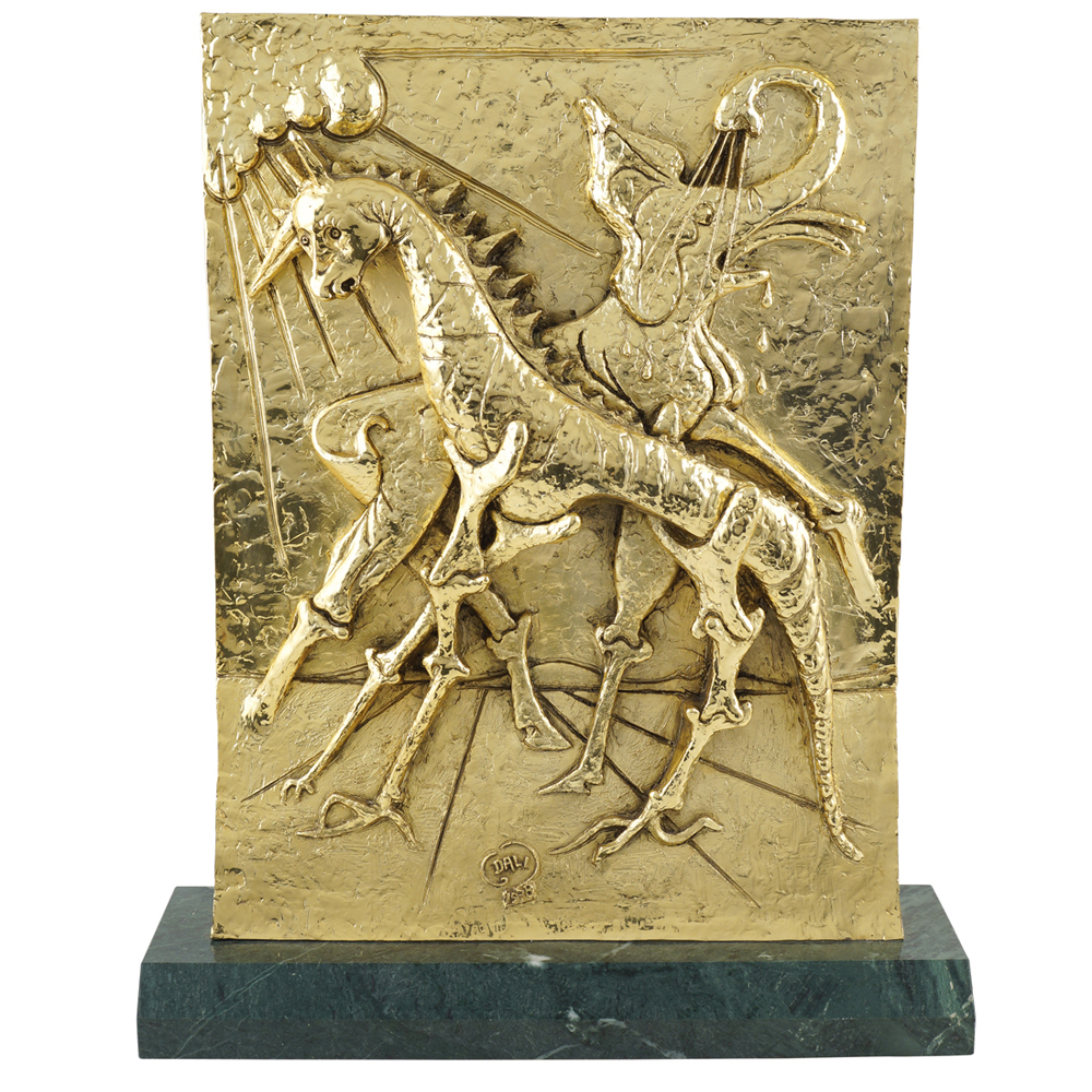 Salvador Dalì Figueres 1904 - 1989 58x48x15 cm. "La nascita degli animali", scultura multiplo in argento galvanico dorato, es.398/999, poggiante su base rettangolare in marmo verde