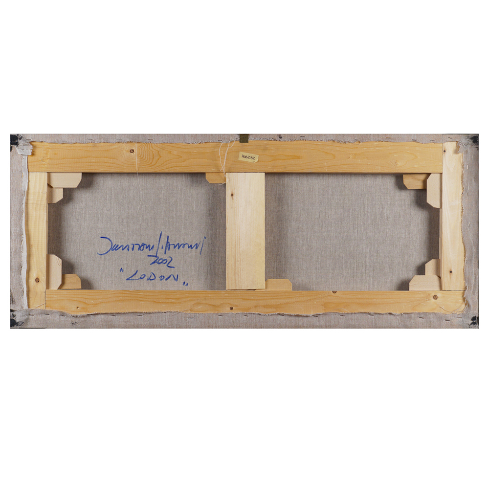 "London", 2002, olio su tela, entro cornice, firma, data e titolo al verso sulla tela.