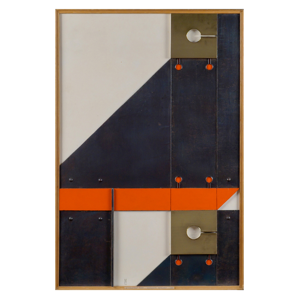 Michelangelo Conte Roma 1913 - 1996 73x48,5 cm. "Continuità verticale", 1969, acrilico con applicazioni in legno e metallo su faesite, firmata e datata sul retro, entro cornice
