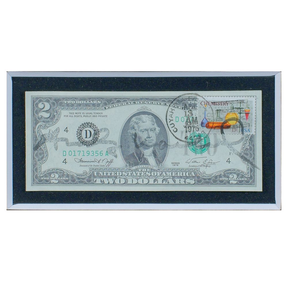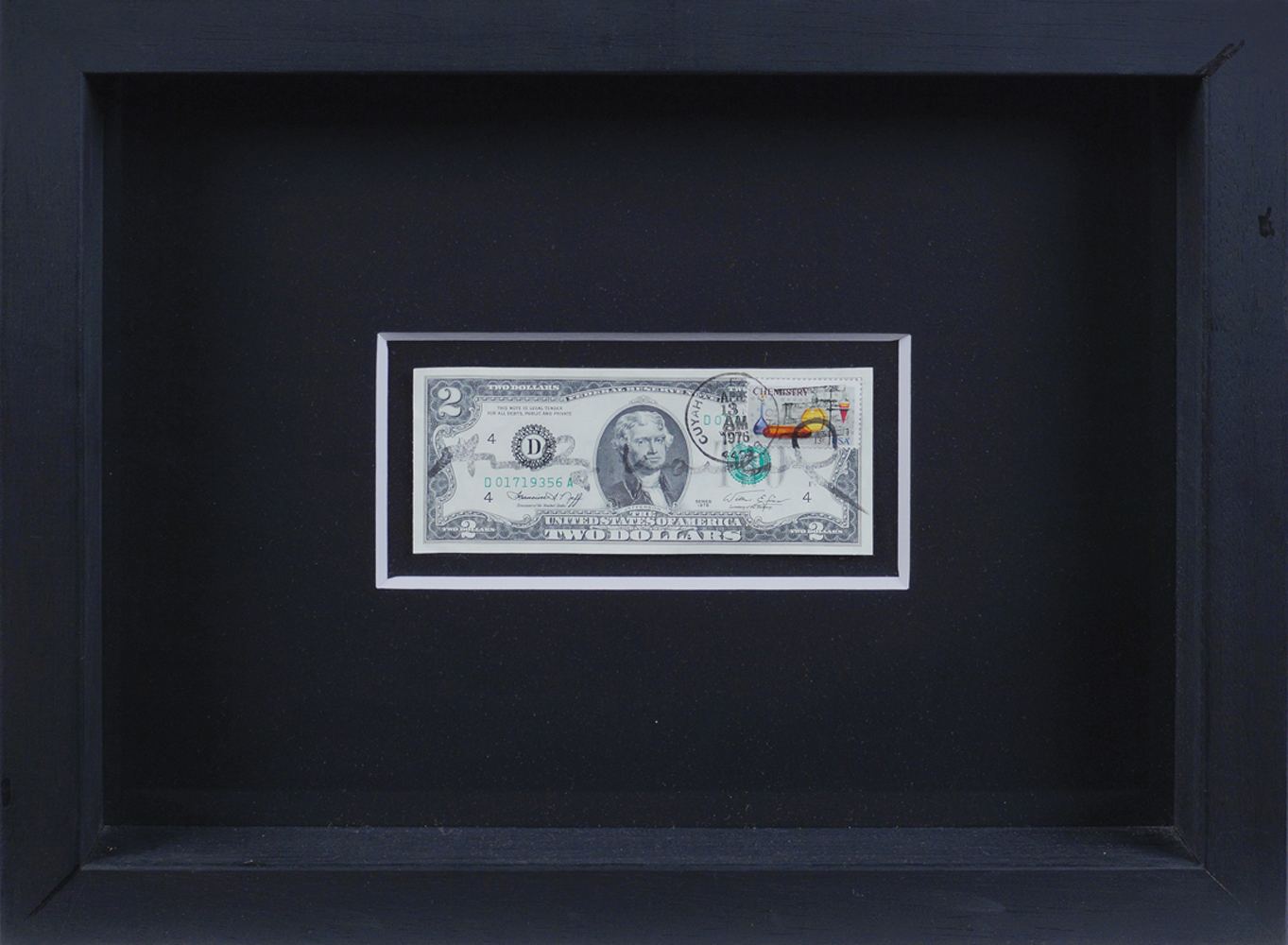 " 2 Jefferson's Dollars", banconota da 2 dollari affrancata e annullata 13 aprile 1976, firmata sul fronte con marker nero, entro cornice. Il retro raffigura un quadro di Trumbull del 1816 sulla Dichiarazione d'Indipendenza Americana
