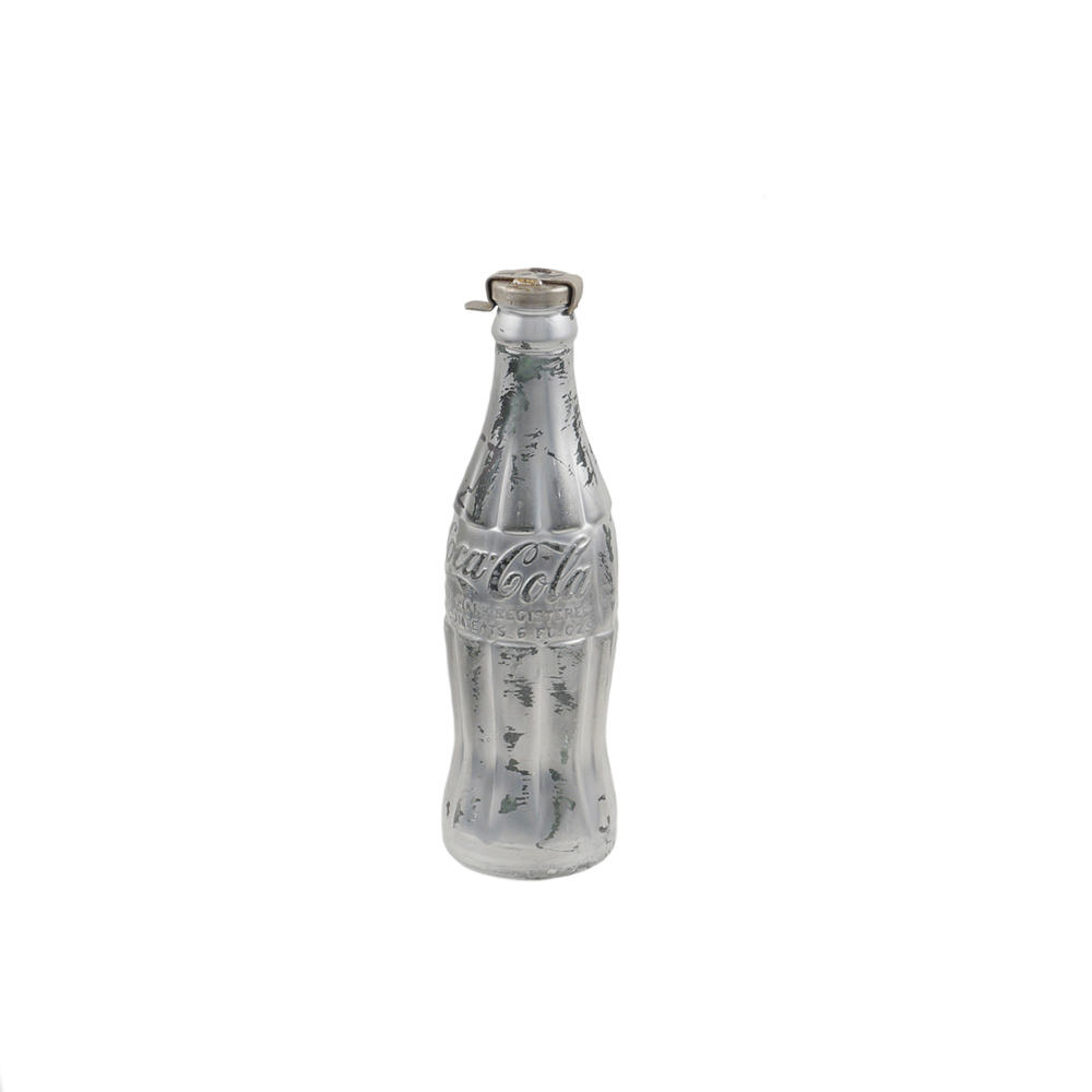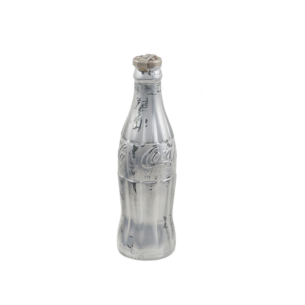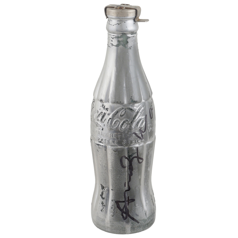 "Silver coke bottle", metà anni '70, scultura volume firmata con marker nero, entro teca in plexiglass.