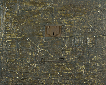 Elio Marchegiani Siracusa 1929 La chiave sbagliata incomunicabilità, 1963 Materico con applicazioni su tavola, cm. 51x62 Sul verso: firma, data e titolo; Timbro "Galleria Giraldi", Livorno. Autentica dell'Artista su foto.