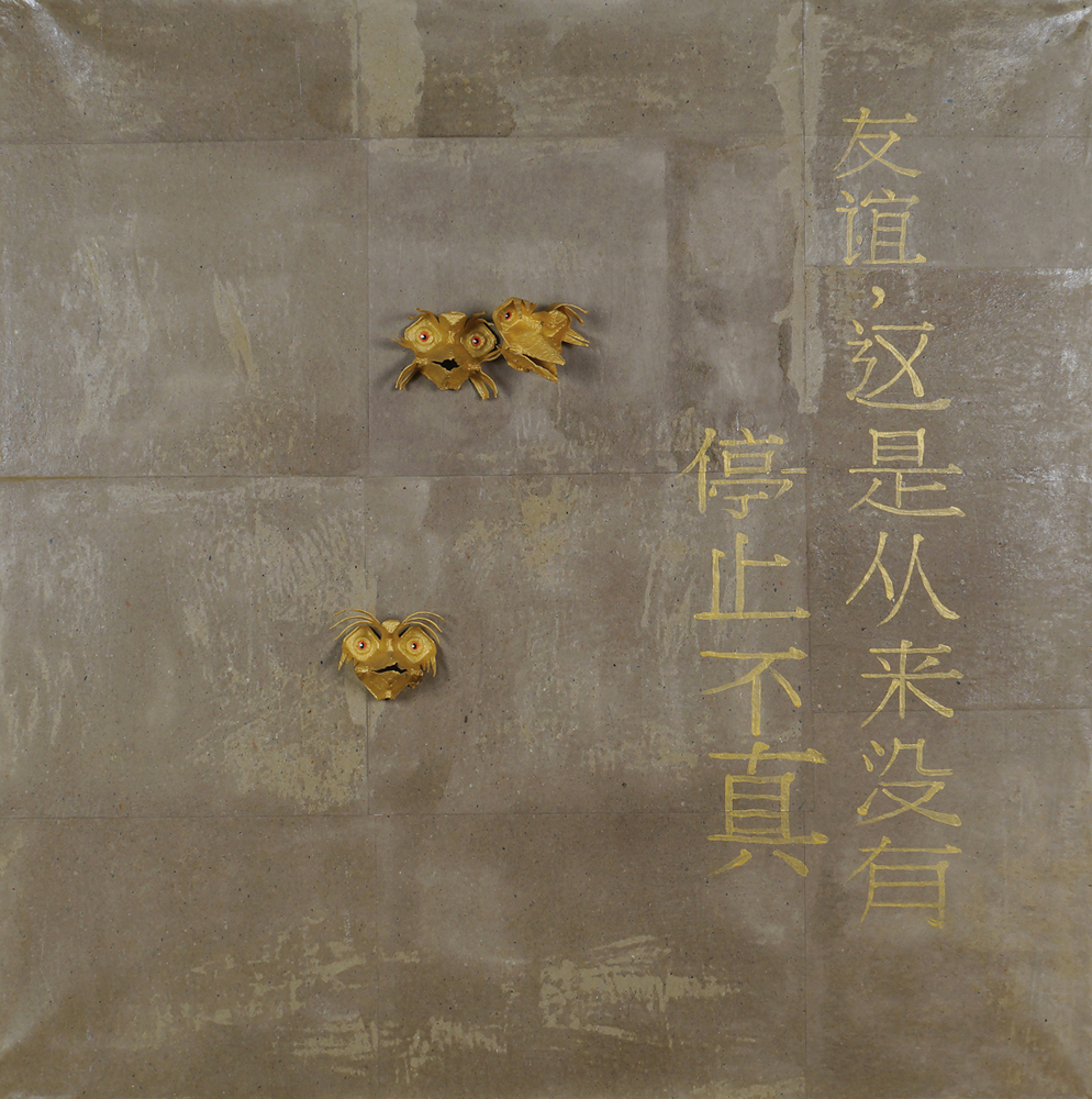 "Animali fantastici parlanti dorati - Amicizia che cessa non fu mai vera", scultura applicata su tela, firmata sul retro.