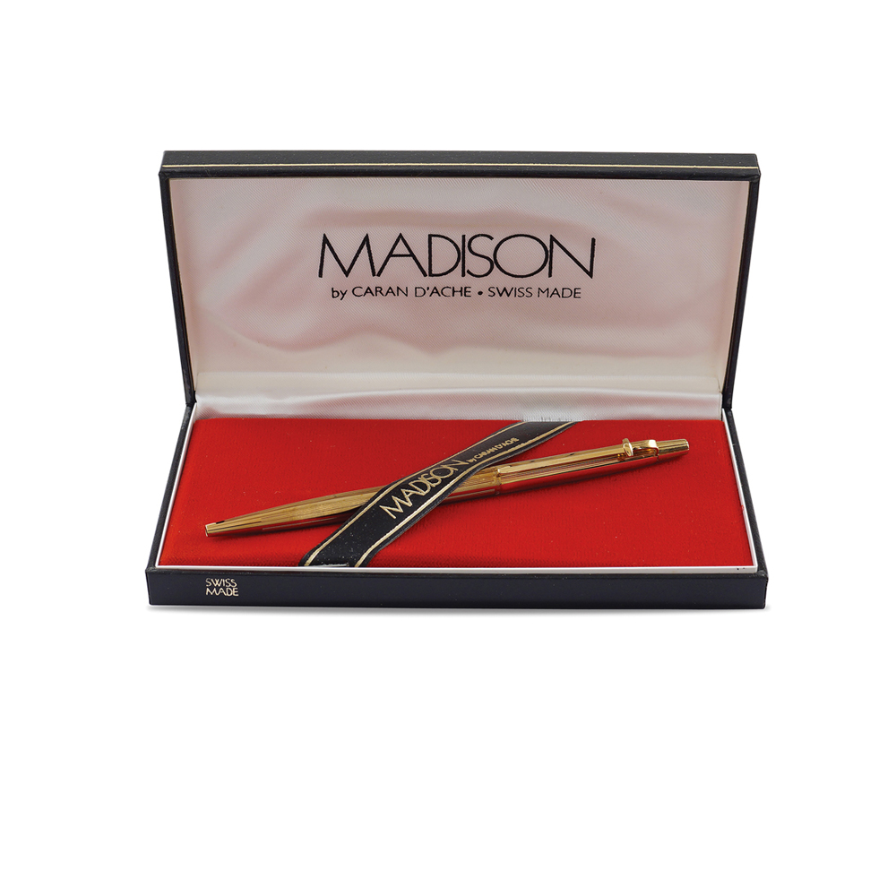 Caran d'Ache, Cisele penna a sfera anni '70 l. 13,5 cm. placcata in oro giallo con meccanismo a rotazione, entro custodia originale, completa di garanzia