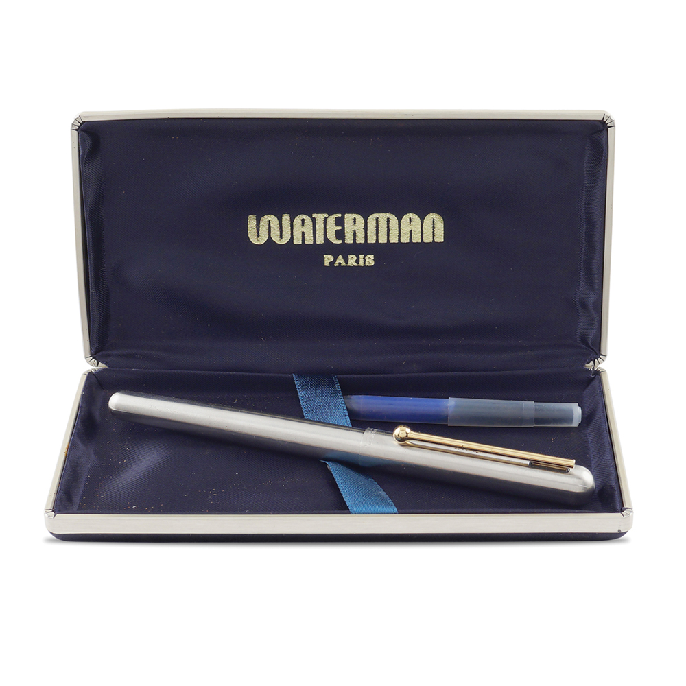 Waterman, penna stilografica vintage l. 14 cm. a stantuffo con pennino in oro giallo 18kt, serbatoio e cappuccio in metallo, clip dorata. Completa di scatola originale