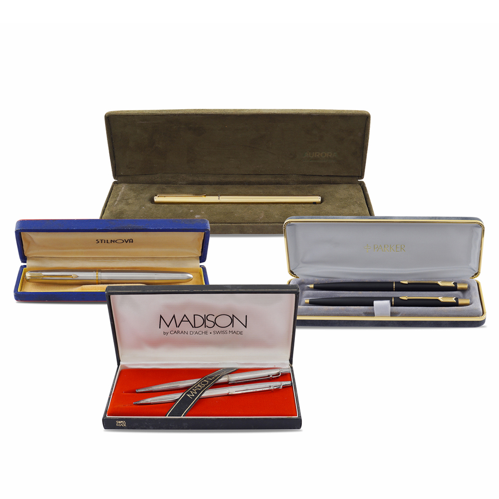 Quattro penne e due portamine vintage una penna Aurora stilografica, una penna Parker stilografica, una penna Caran d'Ache a sfera, una penna Parker a sfera, un portamine Caran d'Ache e un portamine Parker, tutte complete di custodia originale