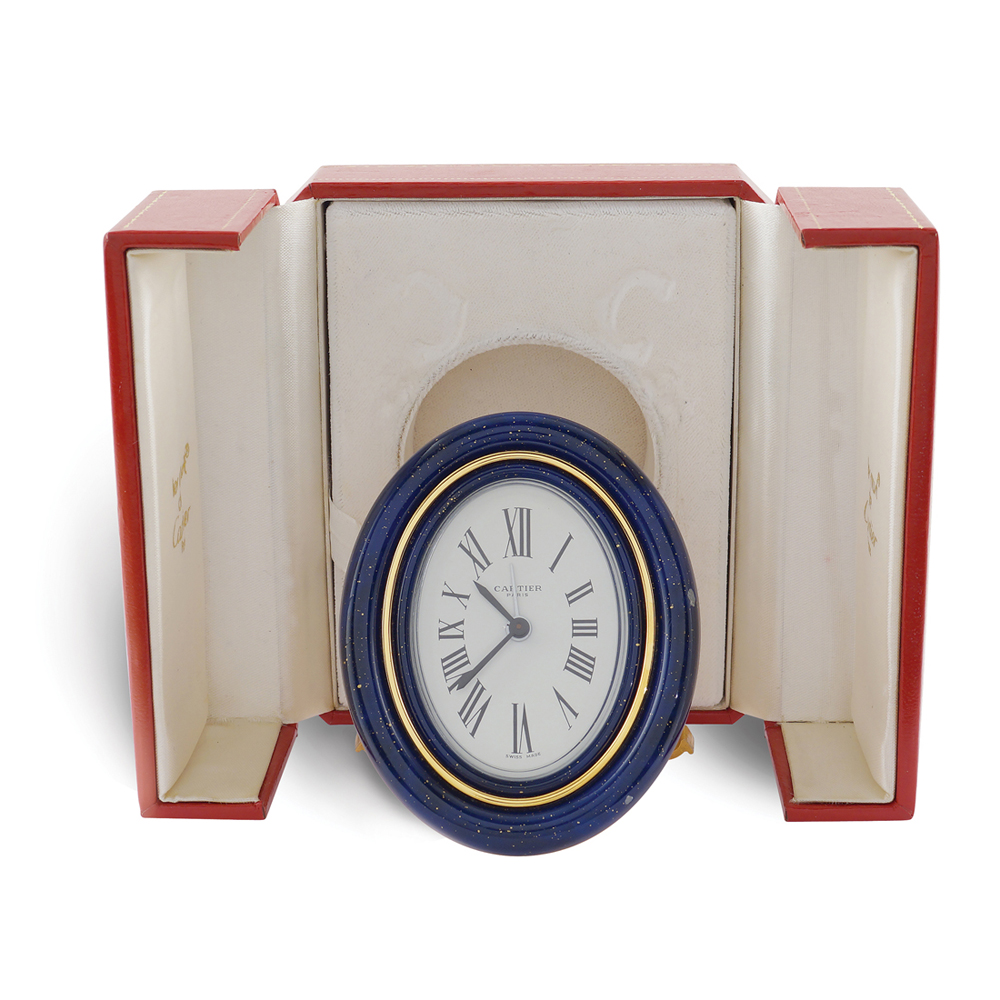 Cartier, orologio sveglia da tavolo Francia, XX Sec. 9x7 cm. di forma ovale in metallo dorato e smalto nella tonalità del blu, ref. 7509 - 15490, entro scatola originale, lievi difetti