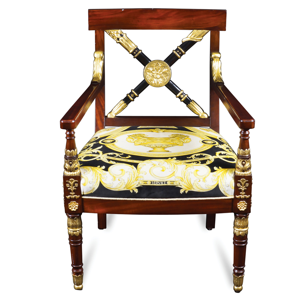 Poltrona stile Impero anni '90 101x70x67 struttura in mogano parzialmente decorata a foglia d'oro, schienale traforato, seduta rivestita in velluto di cotone collezione Versace Le vase Baroque, lievi difetti