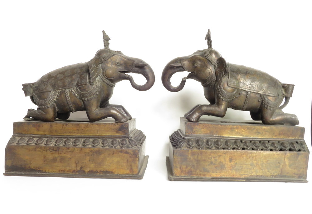 COPPIA DI ELEFANTI, Coppia di elefanti in bronzo, "in posizione di riposo" India transizione XVIII inizio XIX sec. cm 21x15,5, h. cm 23