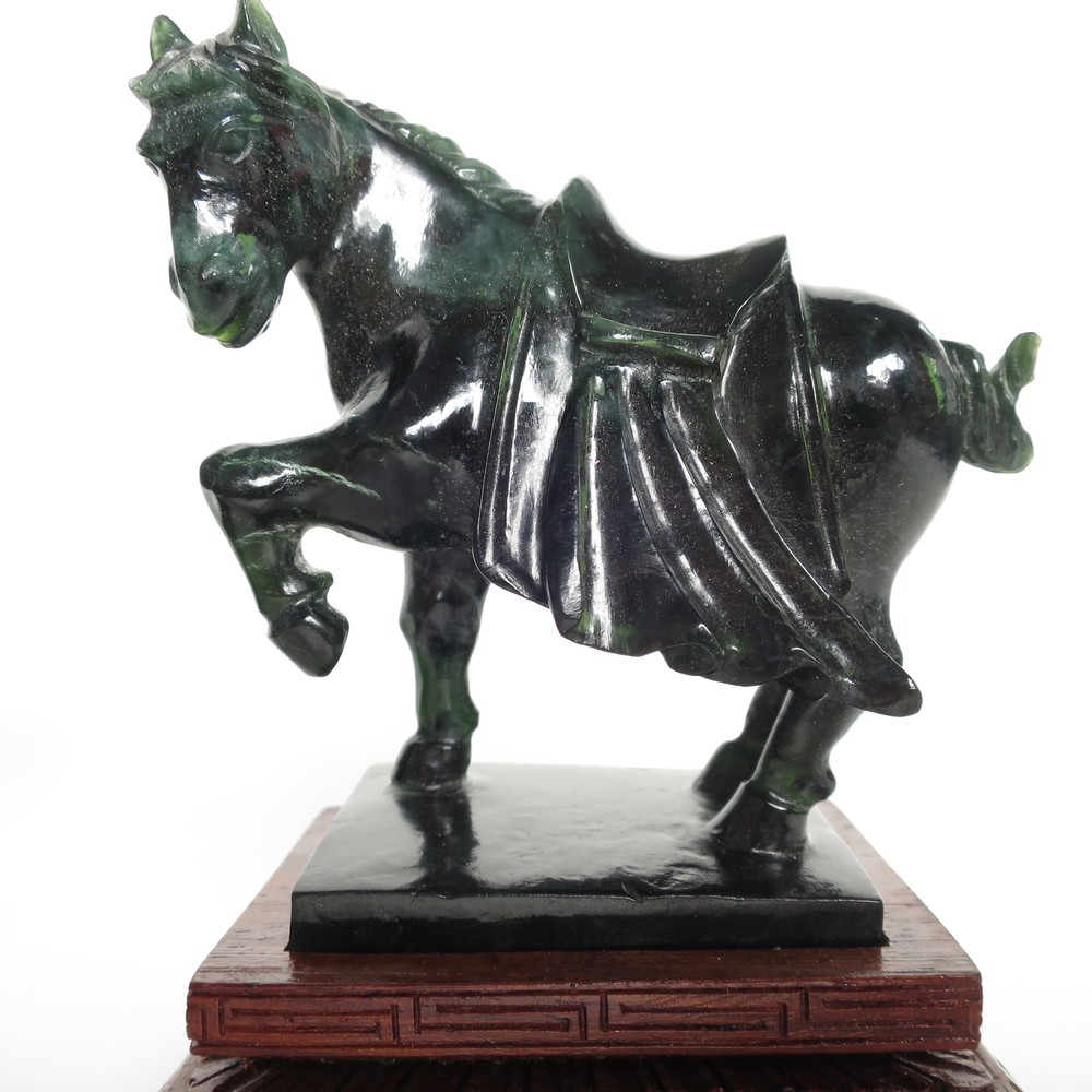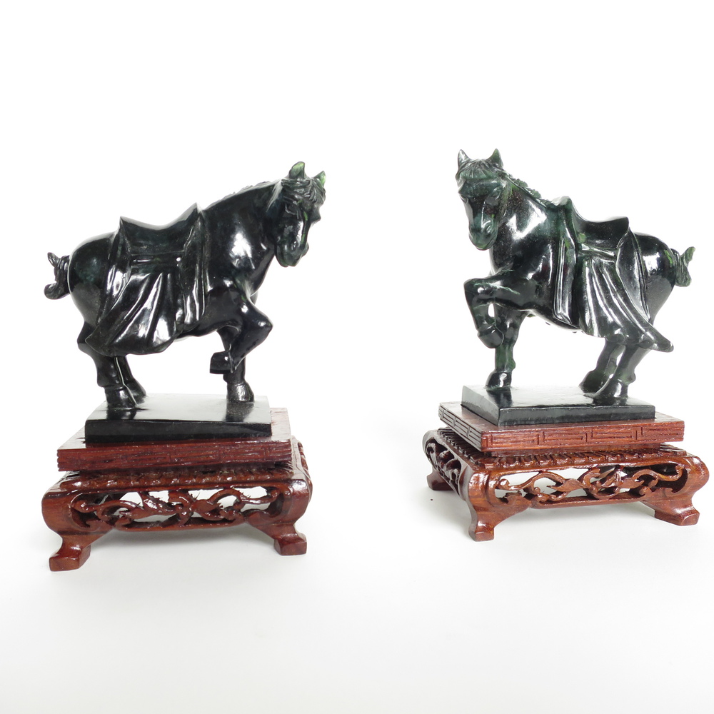CAVALLI GIADA, Coppia cavalli in giada base legno Cina XX sec. h. cm 14