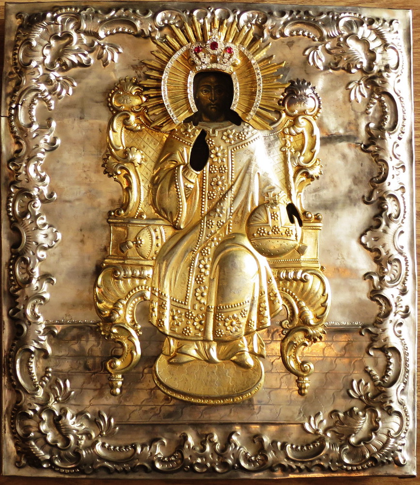 ICONA, Icona su tavola con riza in argento e doratura aureola e corona arrichita da pietre semipreziose. Russia 1862 cm 31,5x36