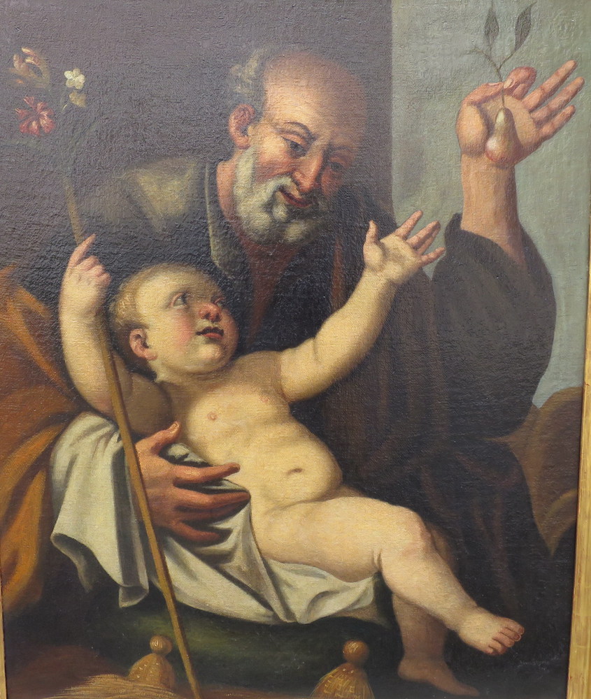 “SAN GIUSEPPE COL BAMBIN GESU'”, Dipinto olio su tela raffigurante "San Giuseppe col Bambin Gesù" cm 68x84. Area Tosco Emiliana XVII sec. cm 68x84