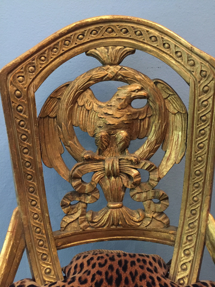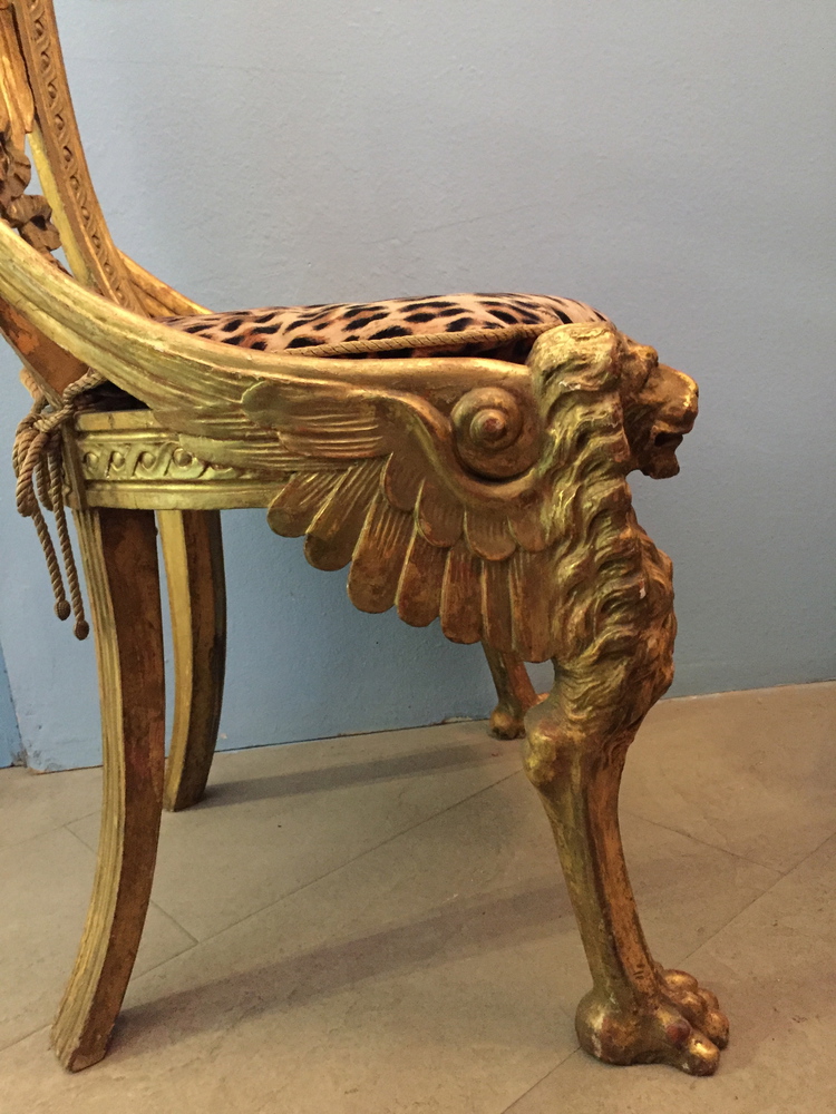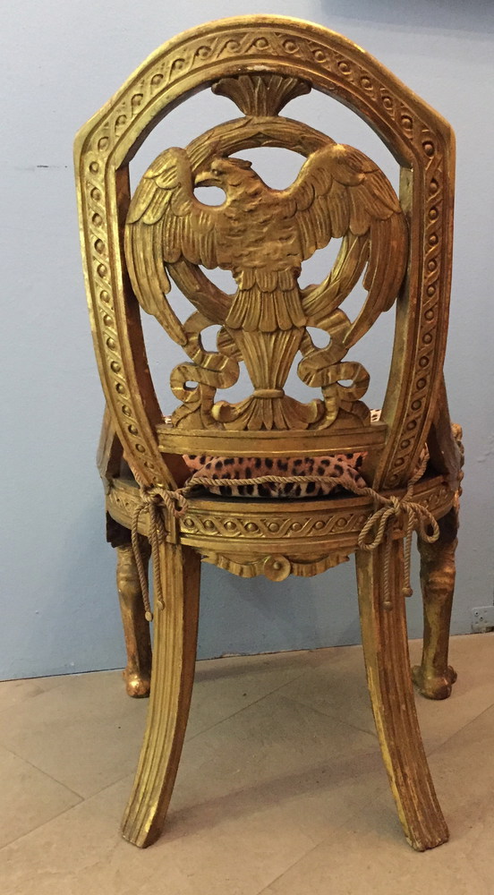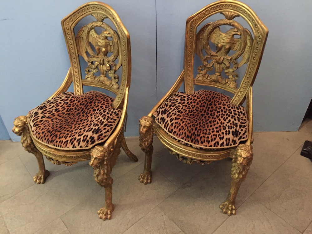 COPPIA DI SEDIE, Coppia di sedie dorate con ricco intervento di intaglio allo schienale,gambe a zampa ferina. Area mitteleuropea 1920 ca.
