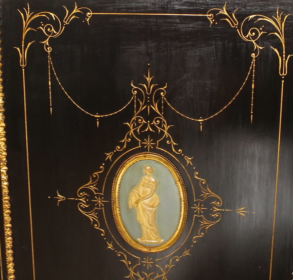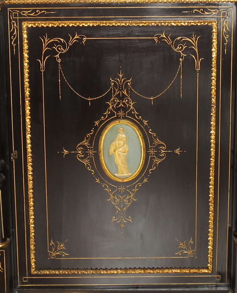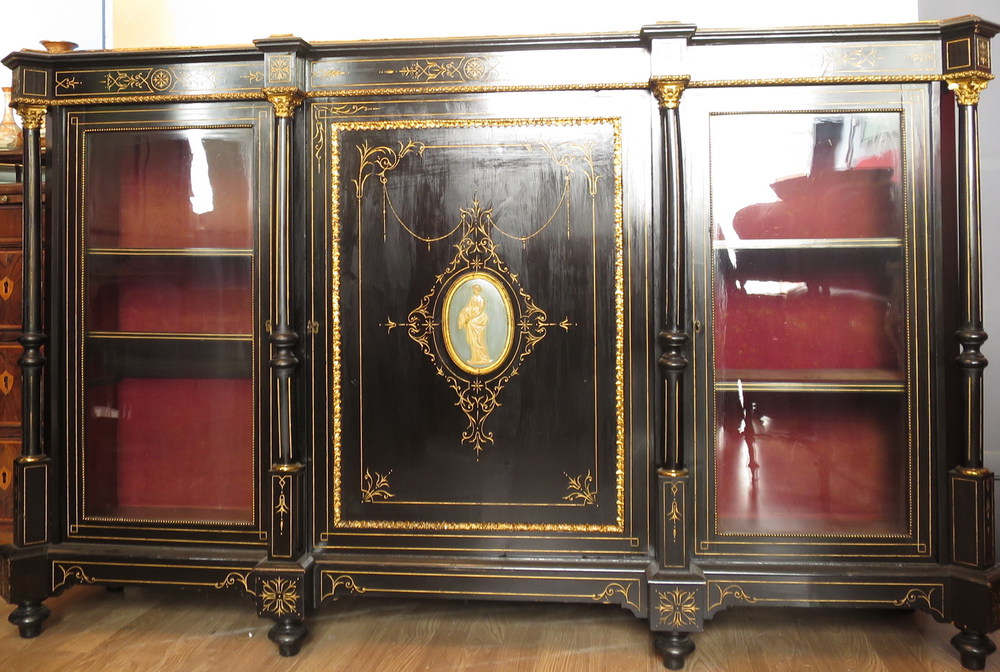 CREDENZA, Credenza ebanizzata intarsiata a tre ante con colonne tornite e capitelli in bronzo dorato. Francia XIX sec. cm 116x41x107