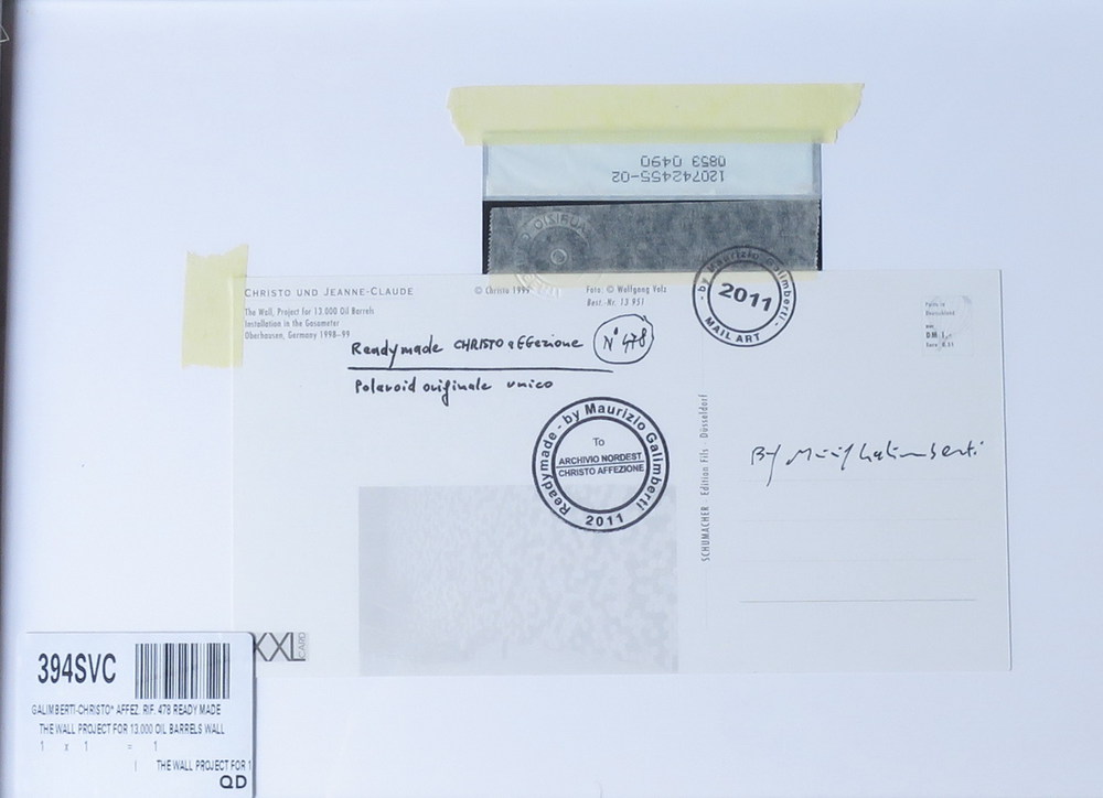 GALIMBERTI /CHRISTO, Christo und Jeanne-Claude CHRISTO READYMADE AFFEZIONE N° 478/2011 Cartolina e polaroid Cm 12x23,5 Dall'opera di Christo " THE WALL PROJECT FOR 13000 OIL BARRELS ISNTALLATION IN THE GASOMETER OBERHAUSEN GERMANY 1998-99 Autentica dell'Archivio Nordest