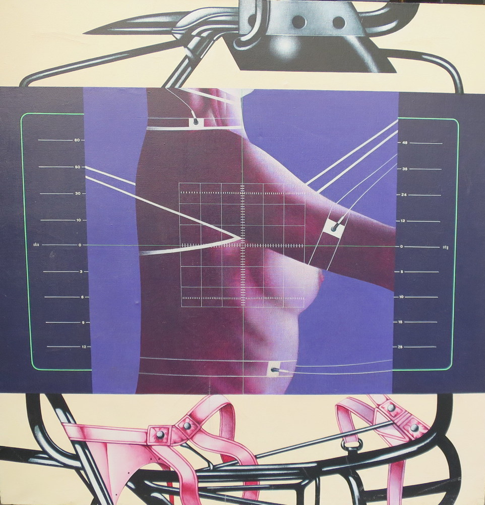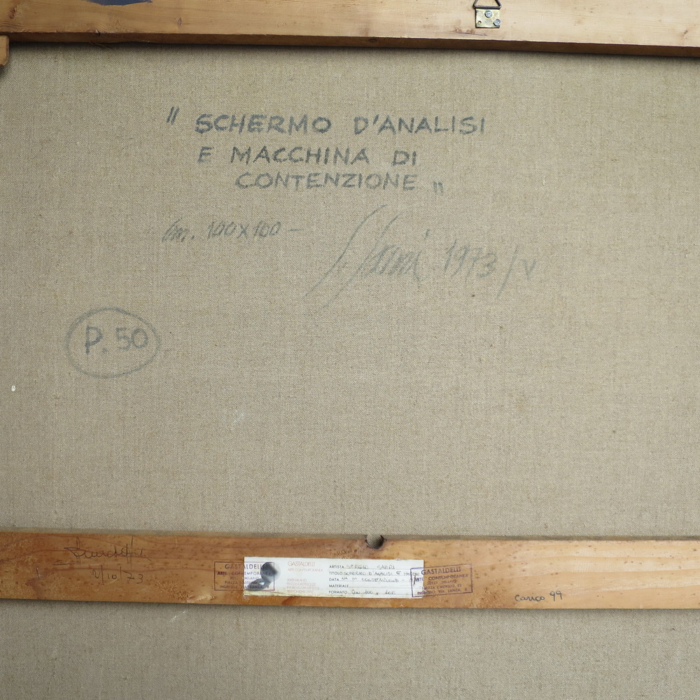 SARRI SERGIO, Sarri Sergio "Schermo d'analisi e macchina di contenzione" Olio su tela cm 100x100 datatato e firmato al verso 1973/V