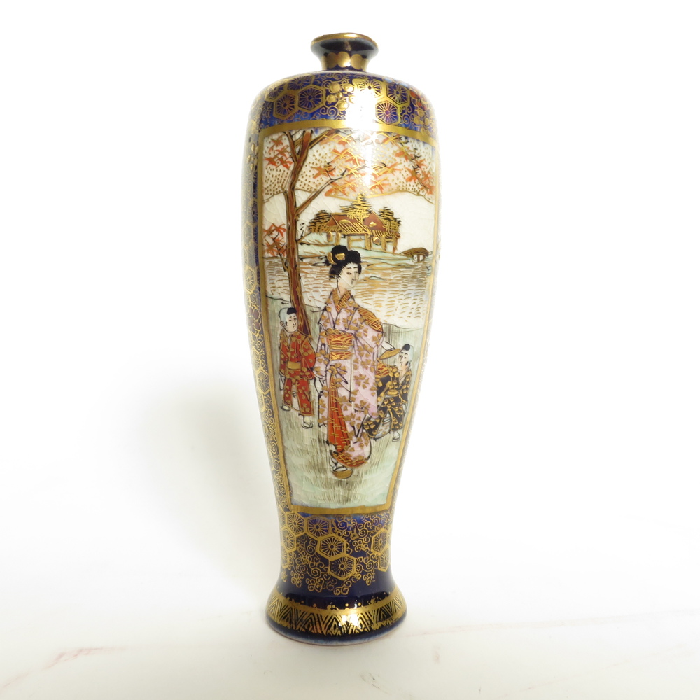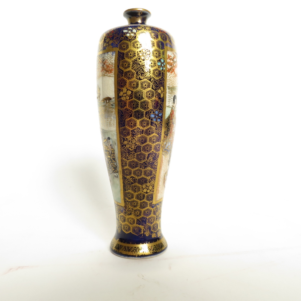 VASO SATSUMA, Vasetto satsuma con decori e scene entro riserve divise da blu cobalto e oro. Giappone Meiji h. cm 12