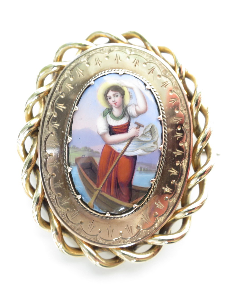 SPILLA, Spilla miniatura in smalto svizzero oro rosa 18 KT metà del XIX sec....
