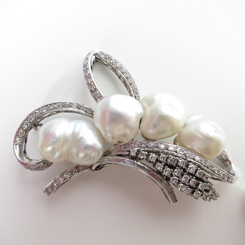 SPILLA, Spilla oro bianco 14 KT, diamanti ct 1,00 perle coltivate. Inghilterra anni 50' gr 23,02