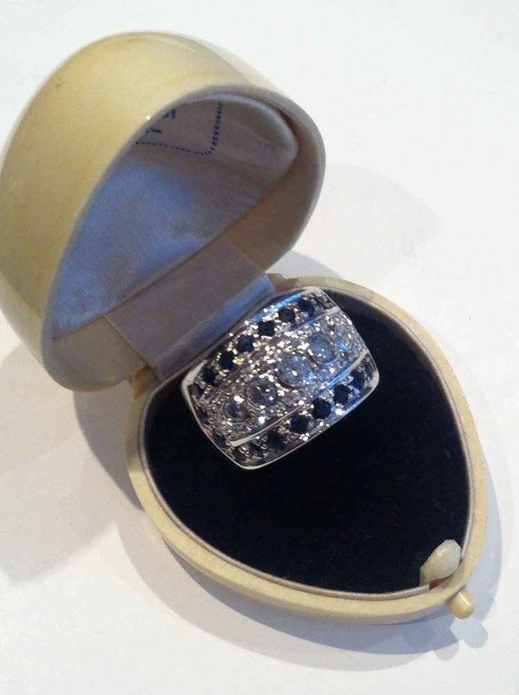 ANELLO, Anello a fascia in oro bianco con brillanti e zaffiri. Seconda metà...