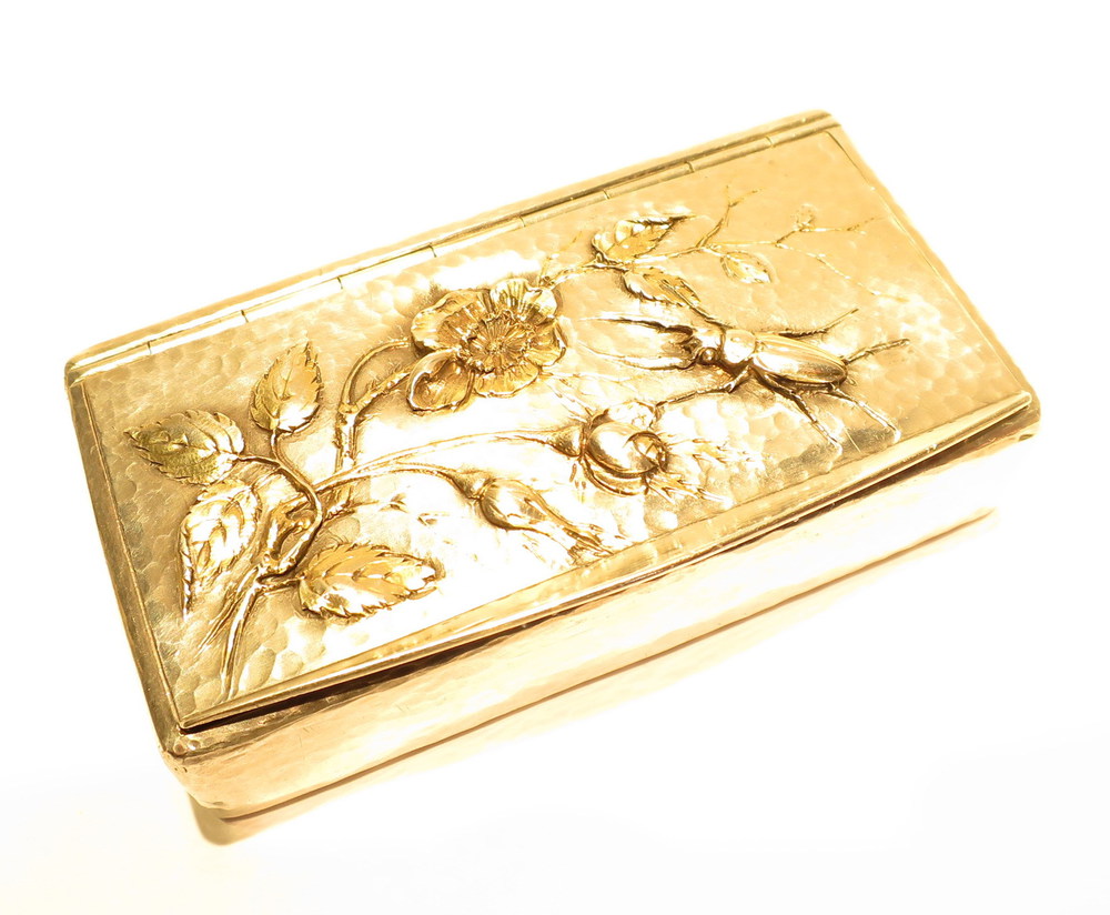 TABACCHIERA, Tabacchiera in argento e vermeil con decoro di insetti su foglie. Parigi 1910 Liberty