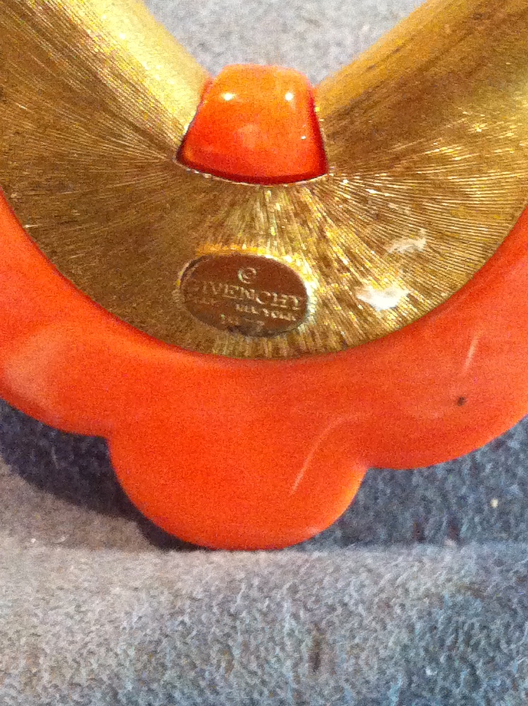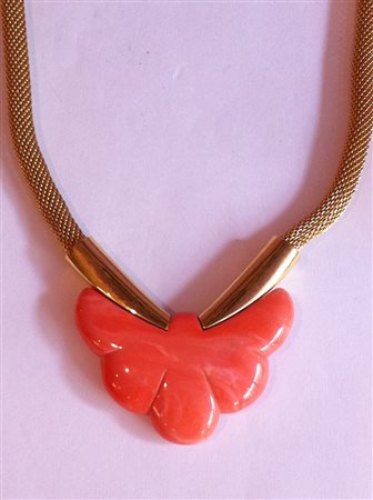 GIVENCHY, Collier dorato con placca centrale in resina arancione firmato Givenchy, Anni '70.