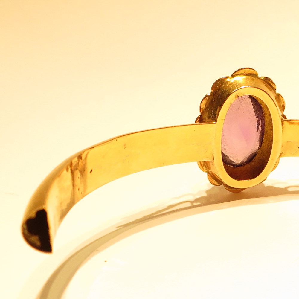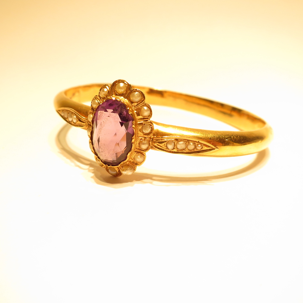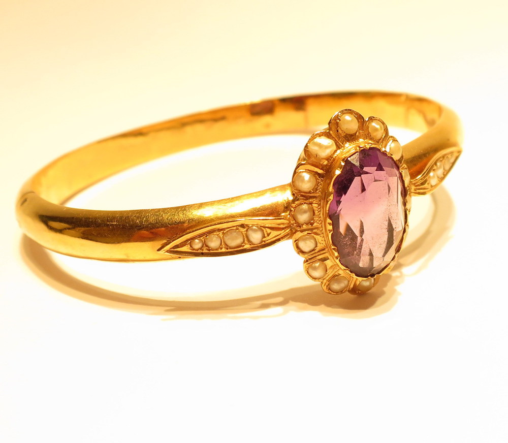 BRACCIALE, Bracciale in oro con ametista centrale montata in ovale e decorata con un giro di microperle. Seconda metà '800.