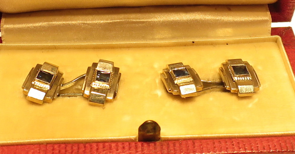 Lotto 278 | GEMELLI, Coppia di gemelli doppi in oro bianco con piccoli zaffiri. scatola...