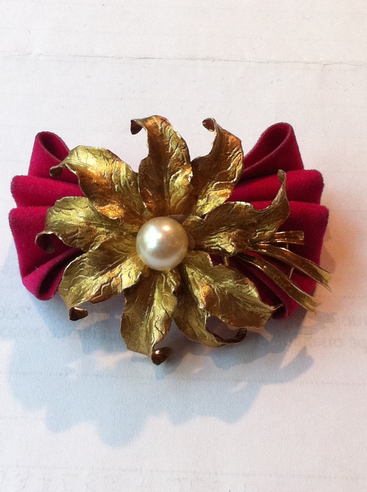 Lotto 282 | SPILLA, Spilla in oro giallo sbalzato e perla centrale con motivo floreale....