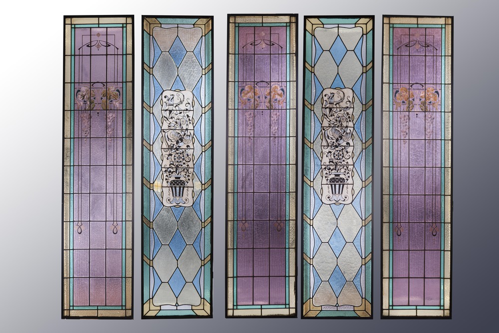 VETRATE, 5 Ante, vetri policromi legati a piombo. Lombardia 1900 ca.