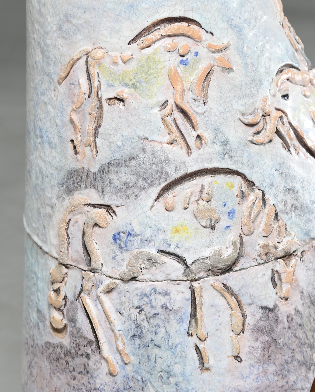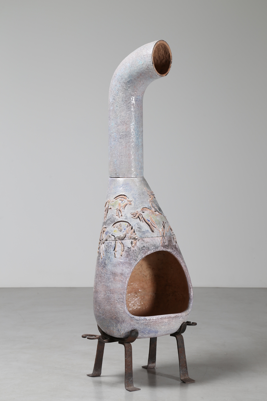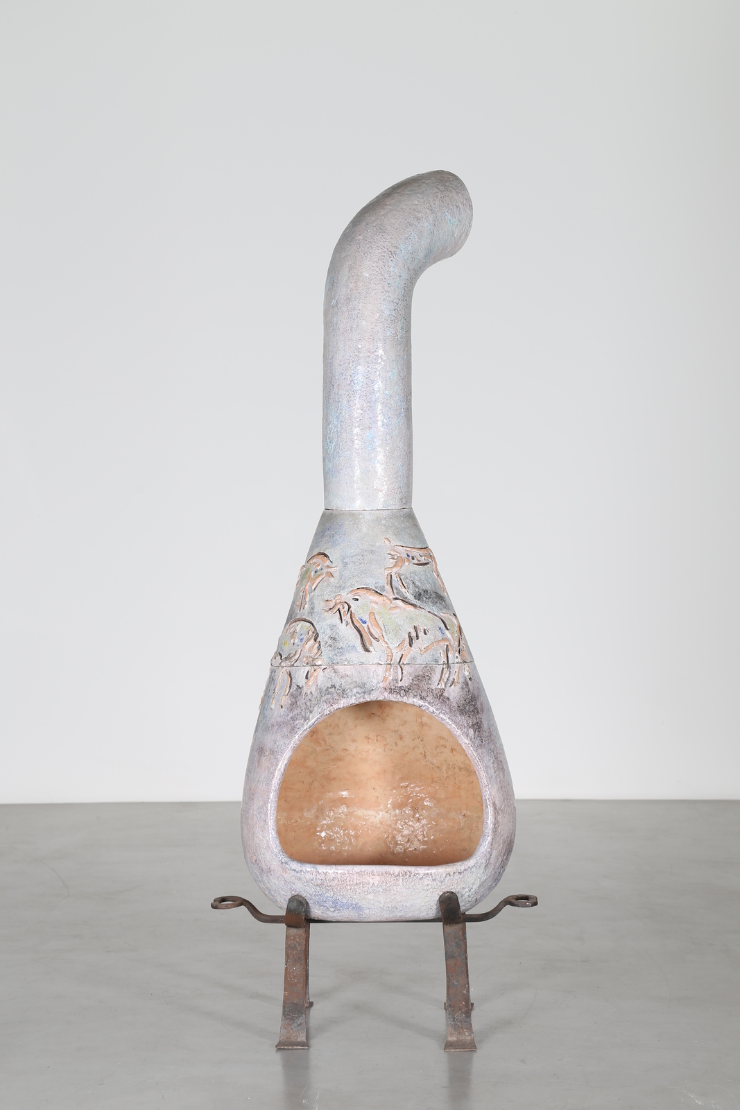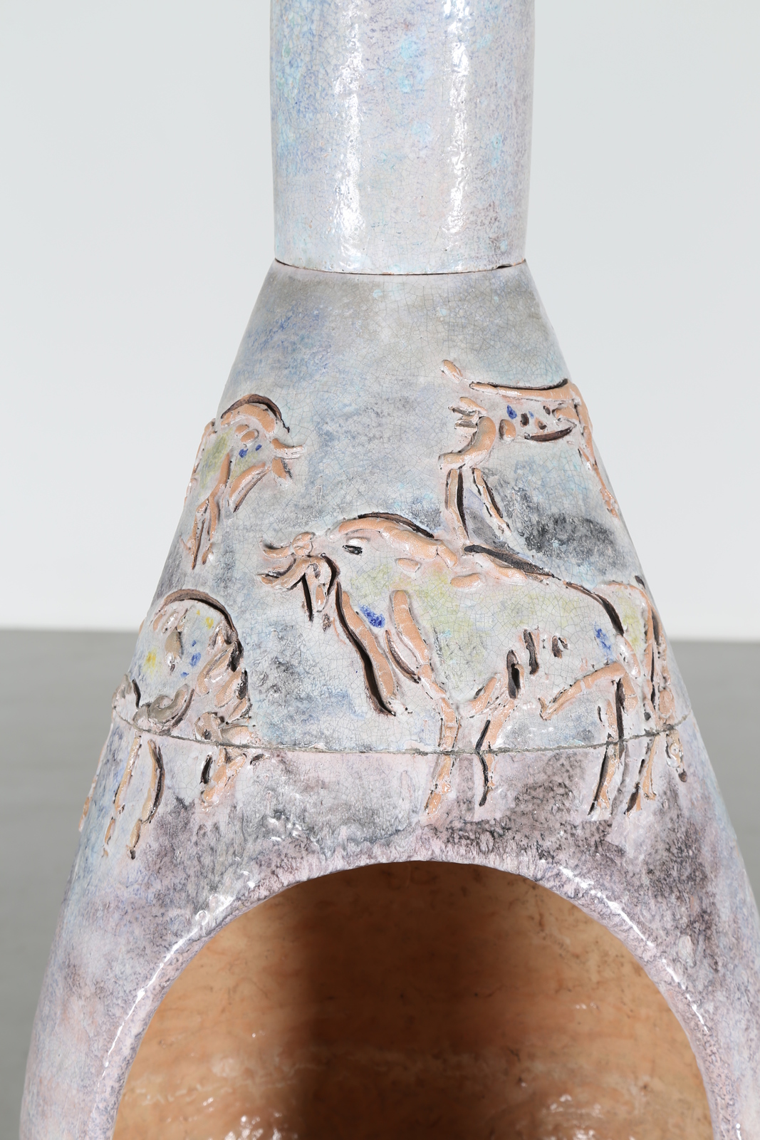 MITRI GIOVAN BATTISTA Chimney majolic sculture painted and engraved in a great fire, with iron base, Chimney, 40’s. Giovanni Battista Mitri, called Giobatta, in the 40’s opens his own furnace in Venezia, Ceramics’ Mitri, refined animalier, in the war’s years dedicates himself to the teaching in the State Institute of Art in Venezia. In the 50’s realizes a production inspired to the archaic suggestions to develop themselves in neocubist solutions.