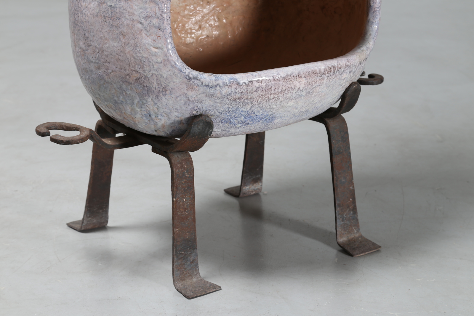 MITRI GIOVAN BATTISTA Camino scultura in maiolica dipinta e incisa a gran fuoco, con base in ferro, Camino, anni 40.