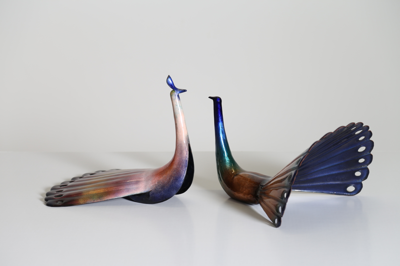 DE POLI PAOLO (1905 - 1996) Coppia di pavoncelli maschio e femmina in rame smaltato, Smalti De Poli Padova anni 50.