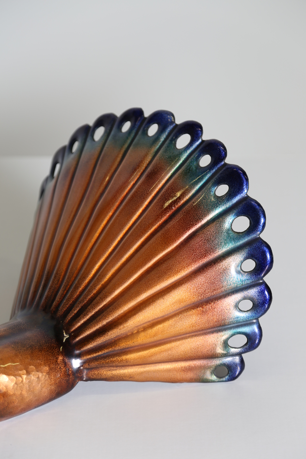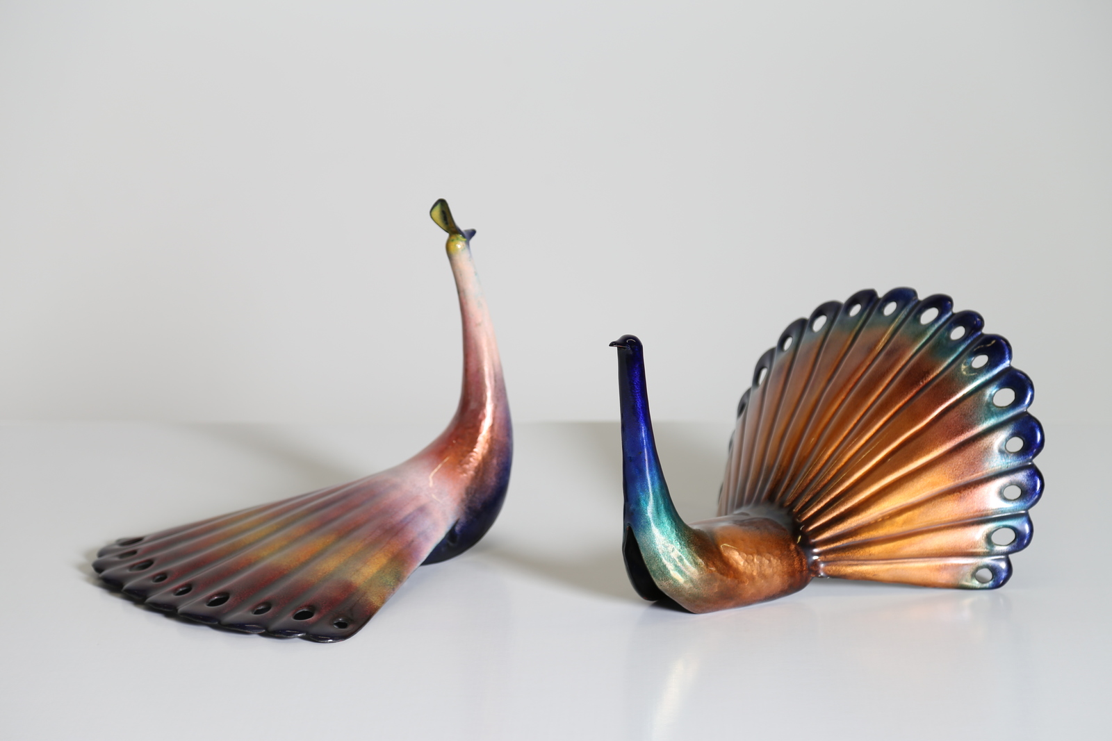 DE POLI PAOLO (1905 - 1996) Pair of enameled copper male and female peacocks, Smalti De Poli Padova 50’s. Collection F. Padova. Literature; Domus num. 263 october 1951 pag. 15/16; Literature; Domus num. 329 april 1957 pag. 25/26/27.