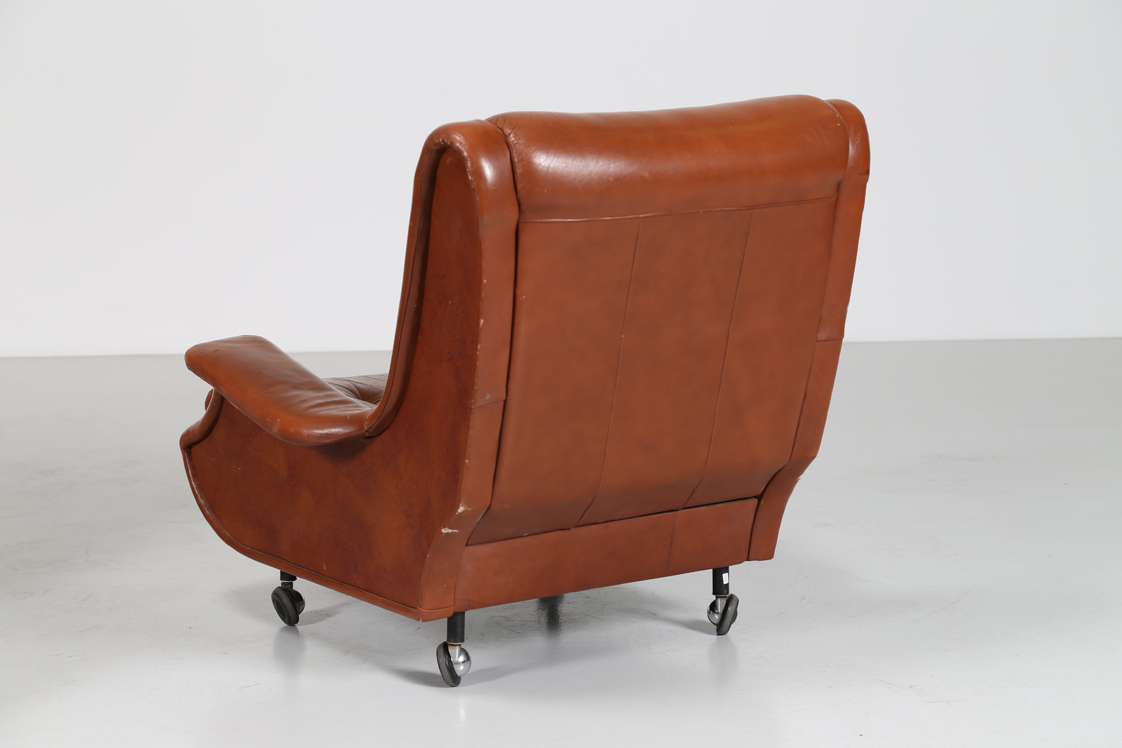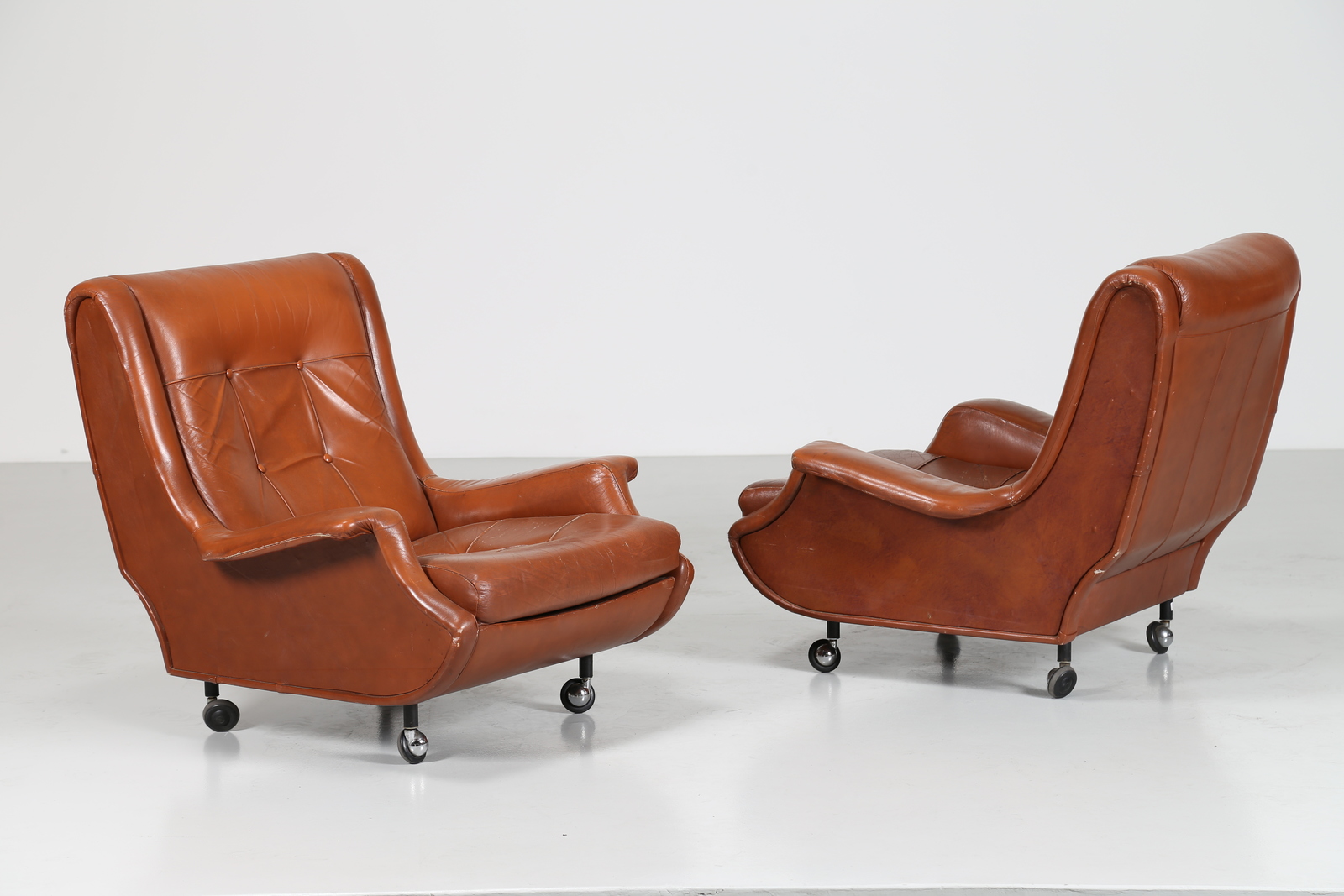ZANUSO MARCO (1916 - 2001) Coppia di poltrone in metallo rivestita in pelle originale. Mod. Regent con rotelle, per Arflex anni 60 Pubblicazioni; Domus num. 395 ottobre 1962 pag. 41; Domus num. 399 aprile 1963 pag. 23; Repertorio 1950-1980, Gramigna, pag. 153 . -. Cm 85,00 x 85,00 x 85,00.