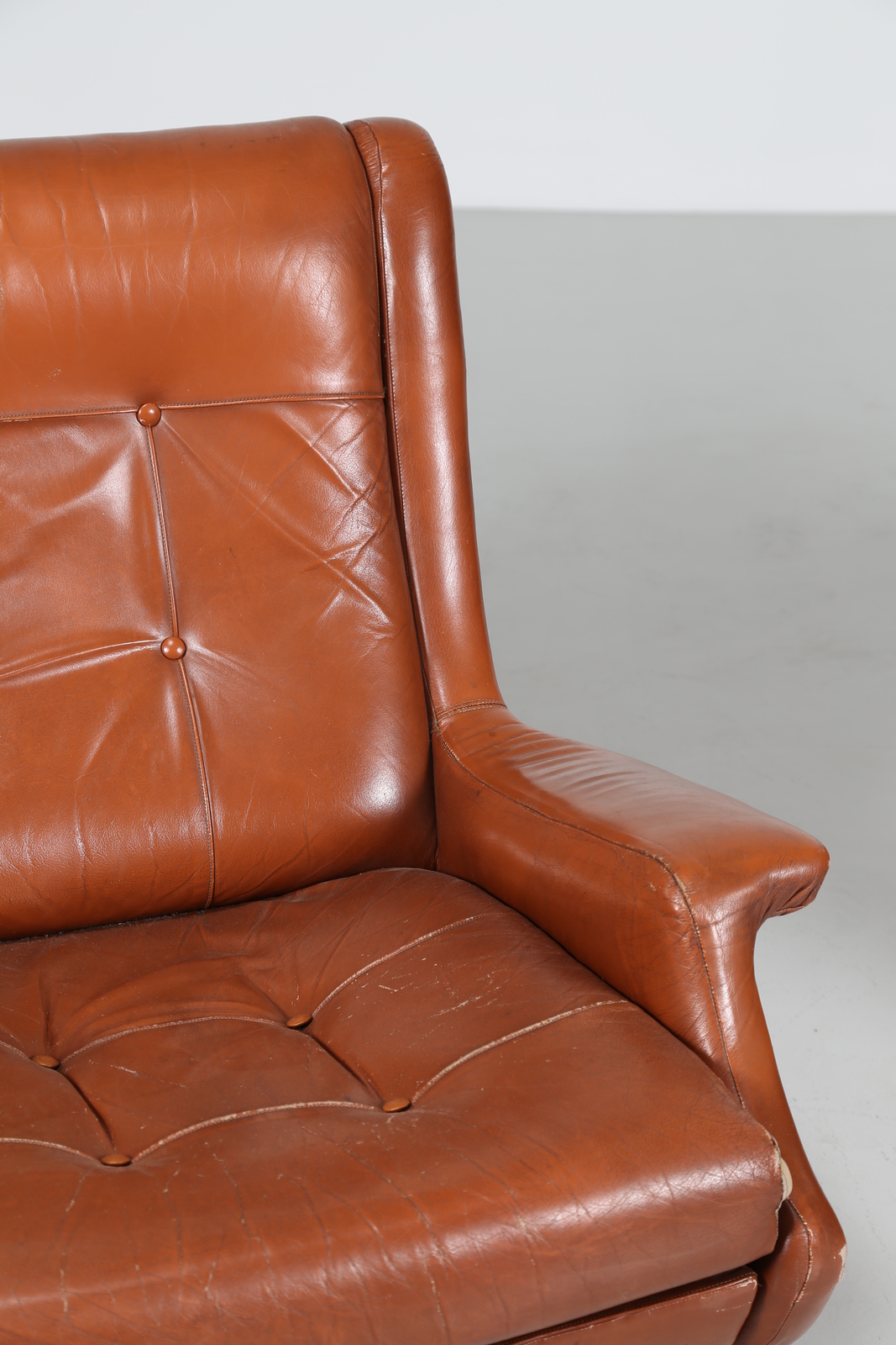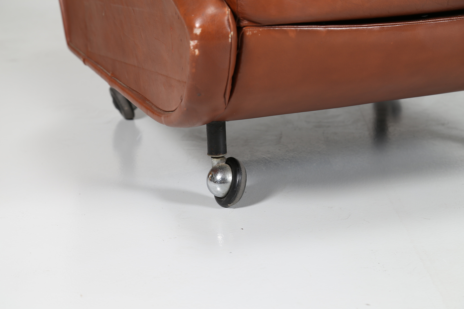 ZANUSO MARCO (1916 - 2001) Pair of metal armchairs covered with original leather. Mod. Regent with castors, for Arflex, 60’s. Literature; Domus num 395 october 1962 pag. 41; Domus num 399 april 1963 pag. 23; Repertoire 1950-1980, Gramigna, pag. 153. . . Cm 85,00 x 85,00 x 85,00.