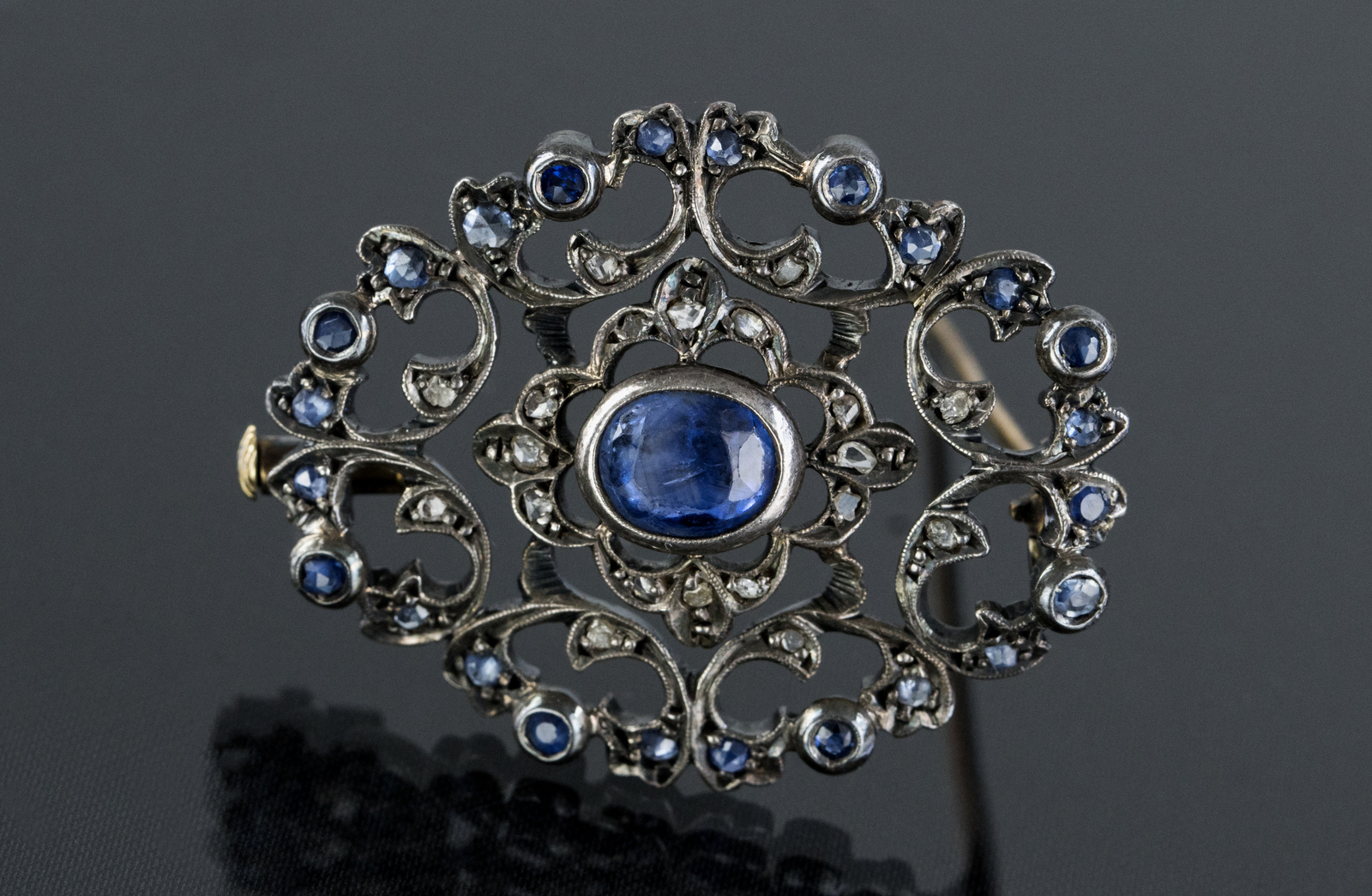 Lotto 51 | [Nessun Autore] Spilla in oro e argento con zaffiri gr 7.68. -. .