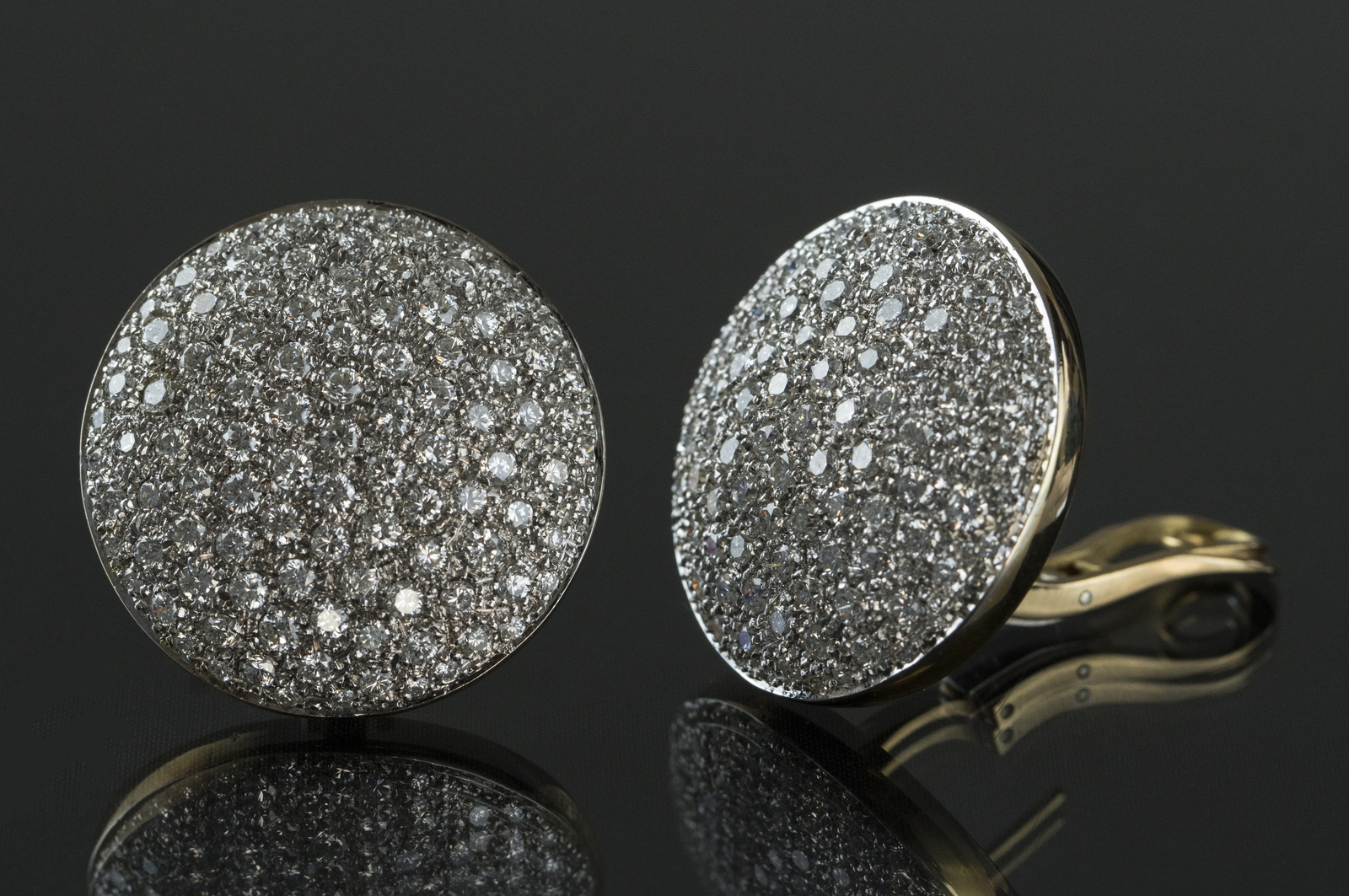 [Nessun Autore] Un paio di orecchini in oro giallo e bianco gr 24.30 e diamanti per cts 8 circa. . -. .
