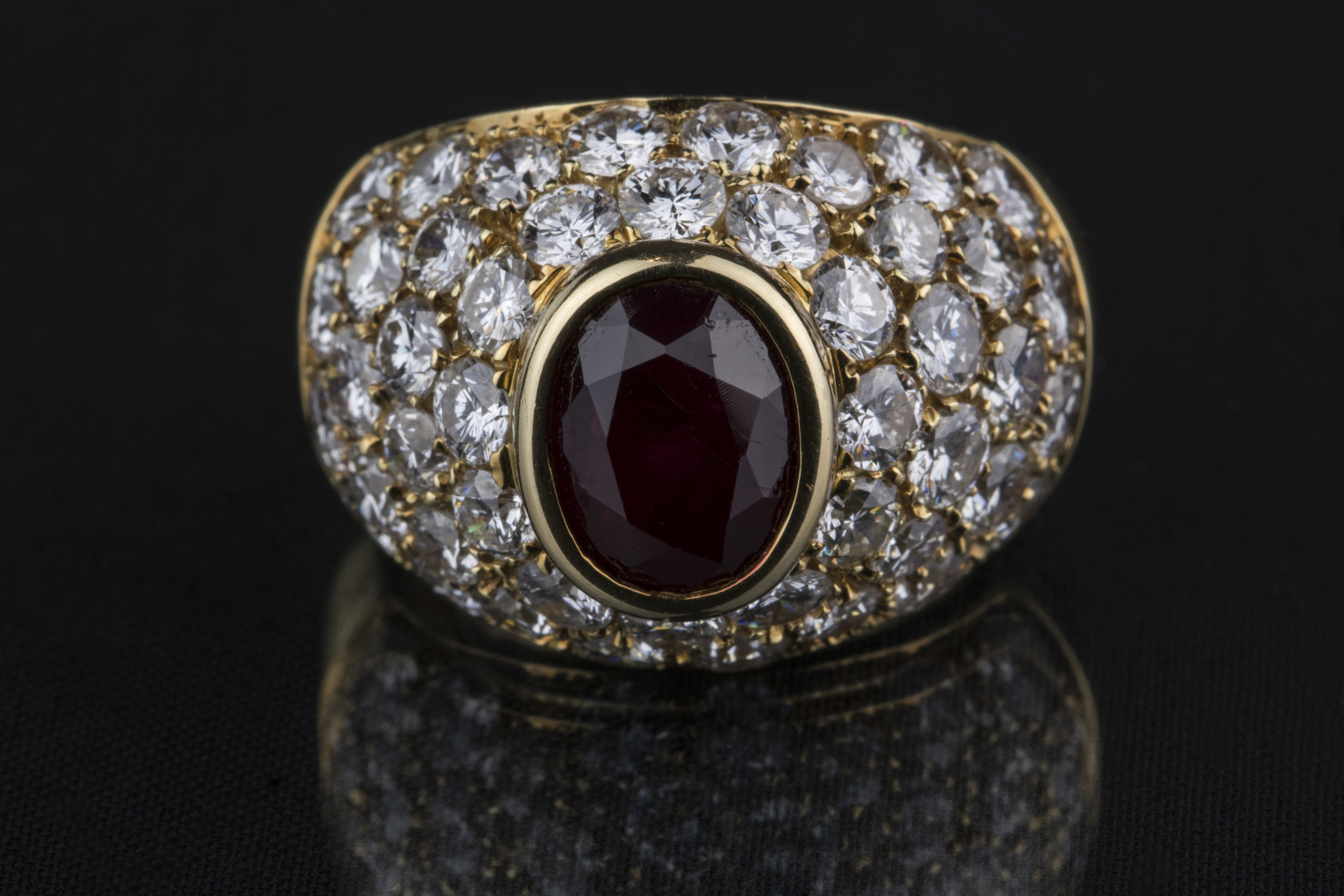 [Nessun Autore] Anello in oro giallo 18 kt gr diamanti per cts 4 approssimativamente e un rubino cts 1.60 circa. . -. .