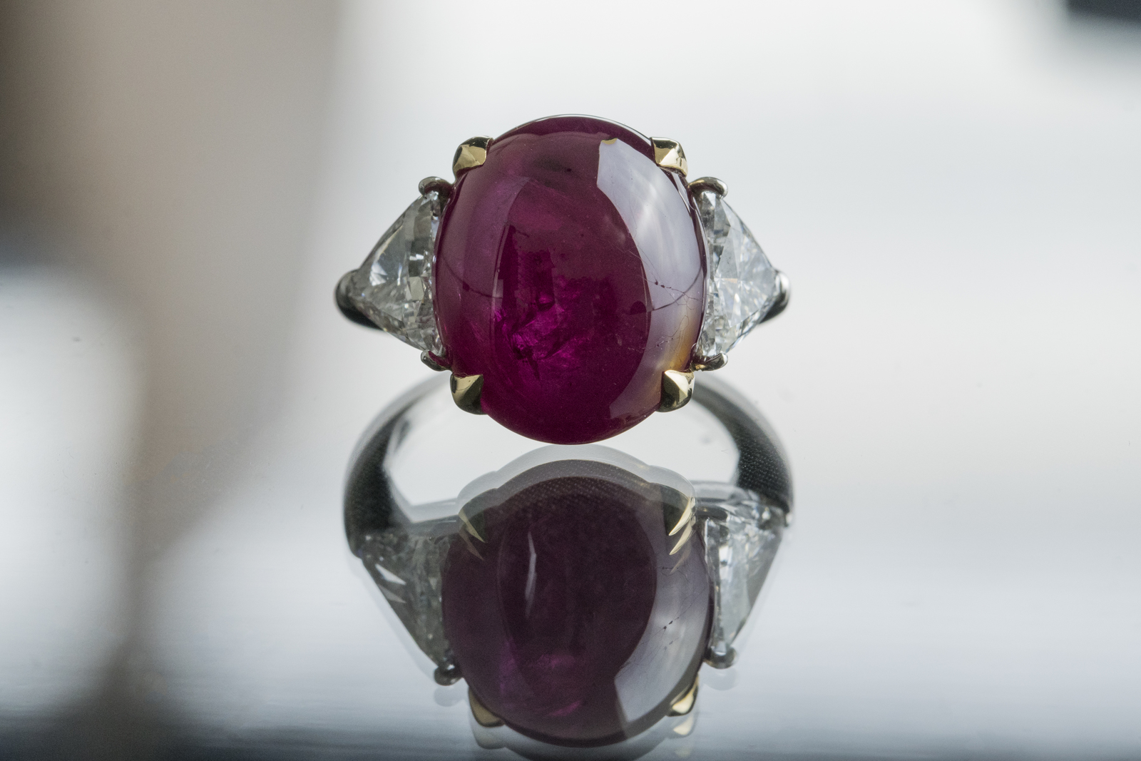 [Nessun Autore] Anello in oro giallo e platino gr 9.90 con rubino cabochon cts 15.80 e due diamanti triangolo cts 1.87. -. .